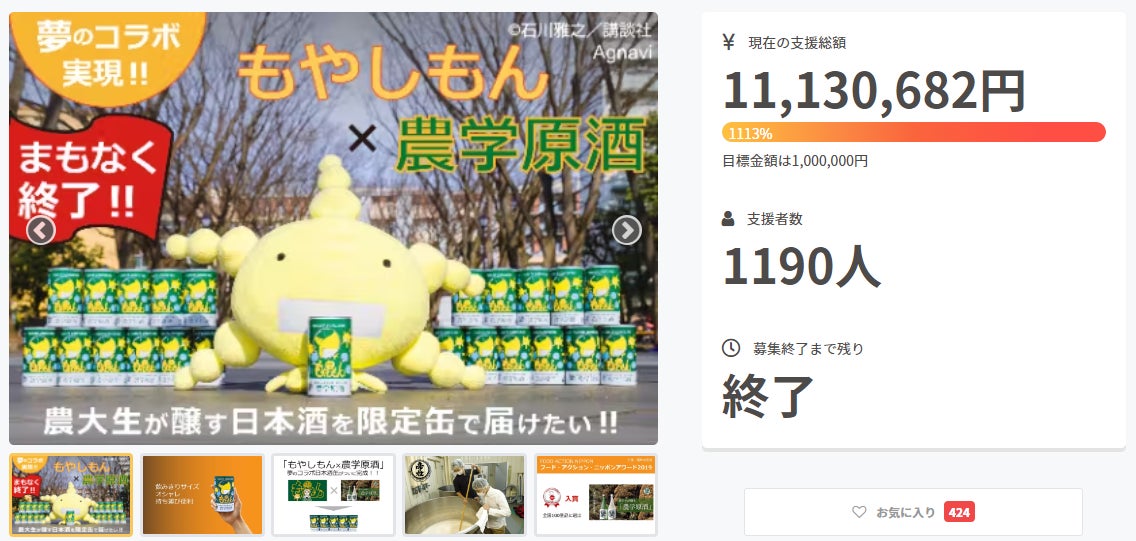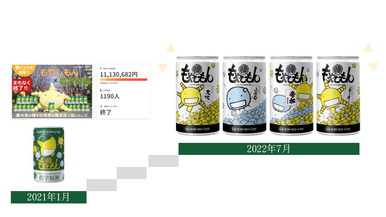 2021年1月に「もやしもん×農学原酒」クラウドファンディング第一弾を実施。当時、弊社代表取締役 玄(以下、代表)は東京農業大学に在学しており、その中で各方面にご協力いただき「もやしもん×農大」の夢のコラボを実現することができました。
