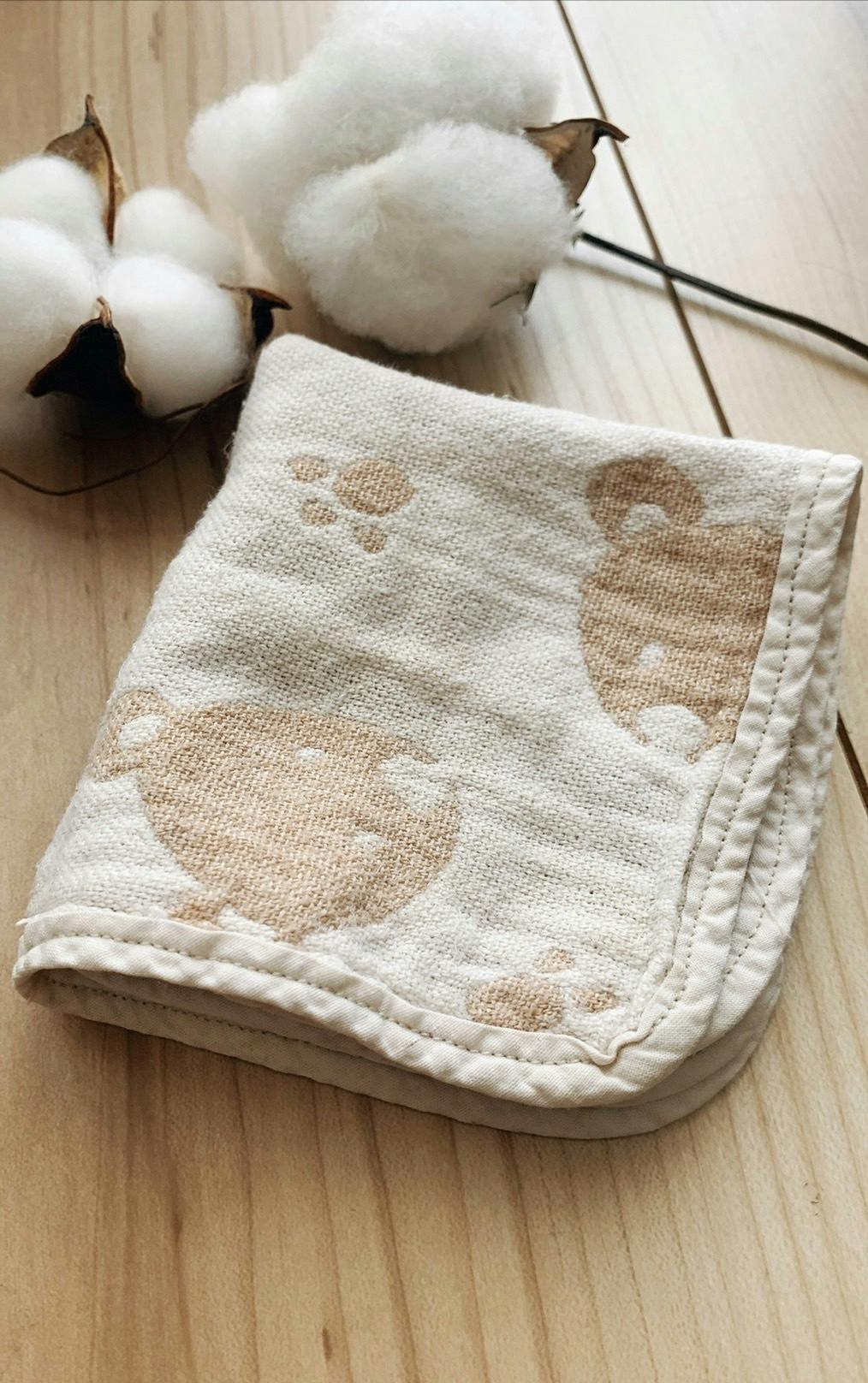私たちが作りたい「泉大津ハンカチ」は、生まれたての赤ちゃんから大人まで、いろんな場面で使っていただけるオーガニックコットン2重ガーゼハンカチです。くまさん柄と無地、2種類を作りたいと思います。