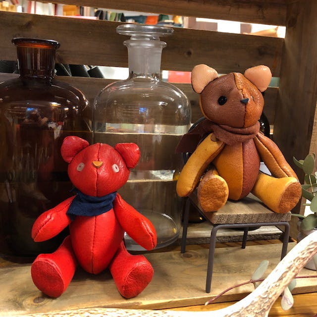 あなただけのクマのぬいぐるみ左はカラフル系、右は暖色系(茶色や赤系の革を使用します)