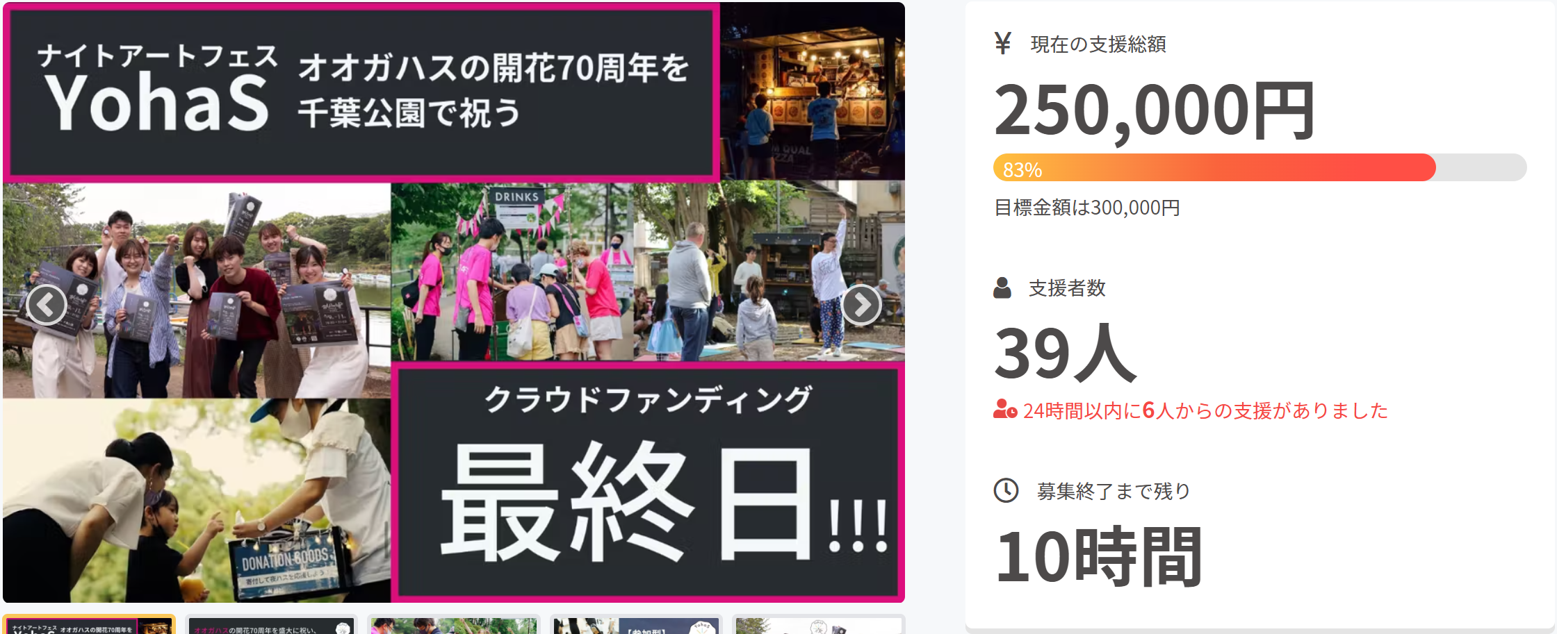 2022/06/06 14:22こんにちは!YohaS運営事務局です!!いつも活動報告をご覧いただきありがとうございます♪本日は YohaS 2022クラウドファンディングの最終日 です!!!YohaS 2022のクラウドファンディングが本日6/6で終了します。いつも応援していただける皆様のおかげで、現在目標額の83%(250,000円)というところまできました。。涙いつも本当にありがとうございます。目標達成まであと、50000円…!!達成に向け、皆様のお力が必要です!!クラウドファンディングも最後まで一緒に盛り上げていきましょう!!お一人お一人のご支援をお待ちしております。 もっと見る