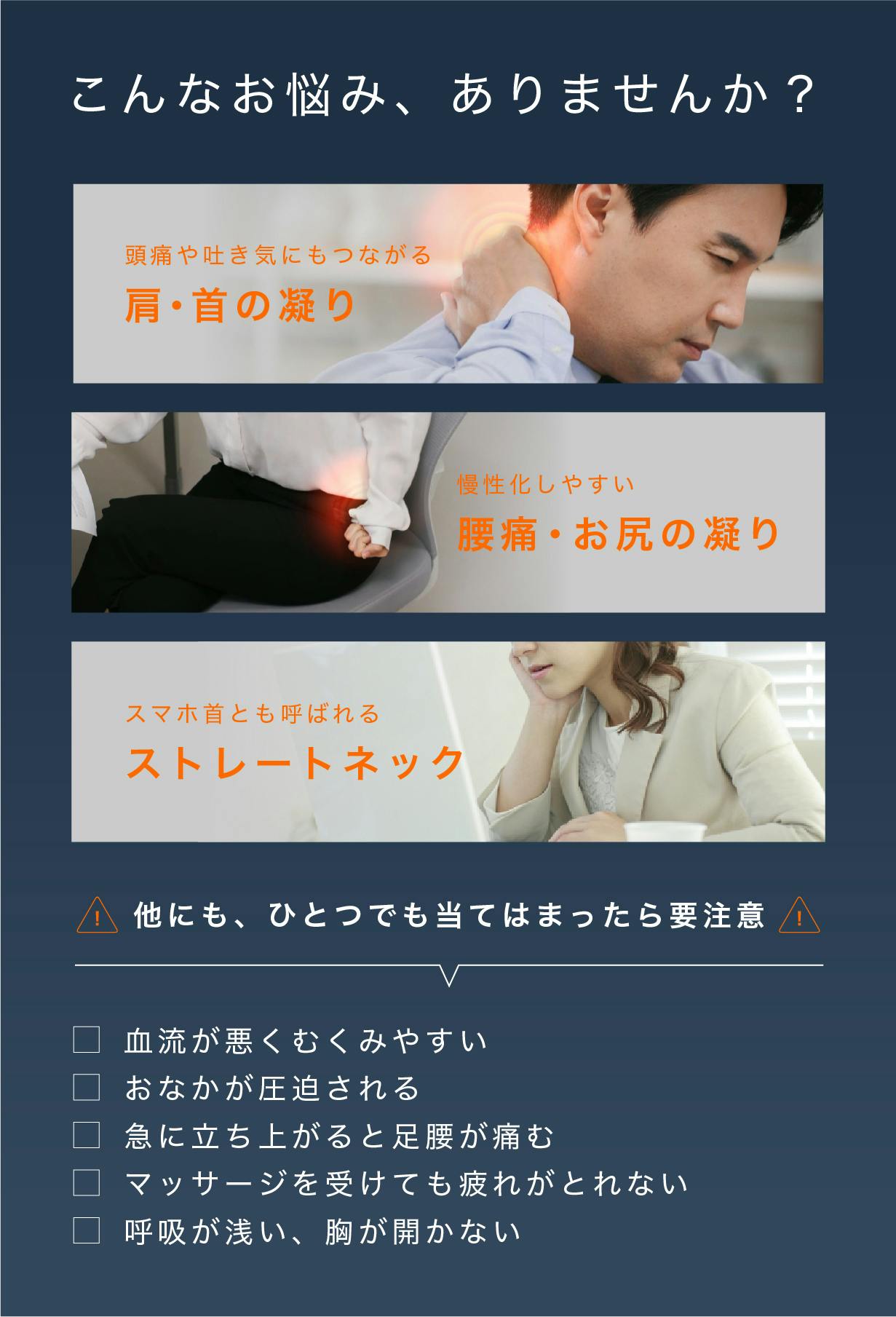昨今のデジタルの進歩や環境の変化の影響などで、デスクワークなどの座る時間が増えています。それにともない、身体へのお悩みを抱えている方も多いです。