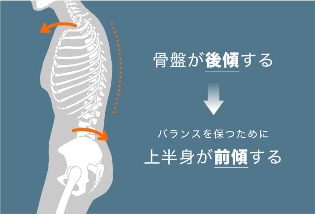 骨盤が後方へ倒れると、上半身はバランスを保つため前方へ傾きます。この影響により姿勢は「く」の字ように曲がってしまい不自然な姿勢となってしまいます。立ったりや横になると腰がラクに感じる場合も、崩れた姿勢による負担集中のサインかもしれません。