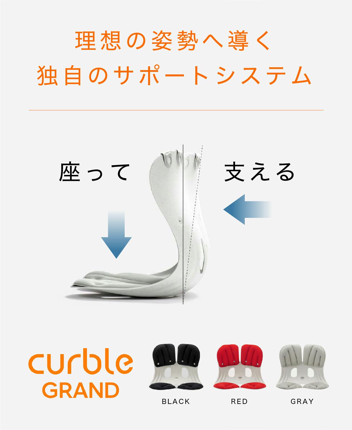実際に人の手で押し、支えてもらっているかのような感覚を体感できます。整った座り姿勢と体圧分散を促す独自の構造、これらの要素で、座るだけで、背筋、腹筋が伸び、驚くほど腰がラクになるのが「カーブルグランド」の特徴です。