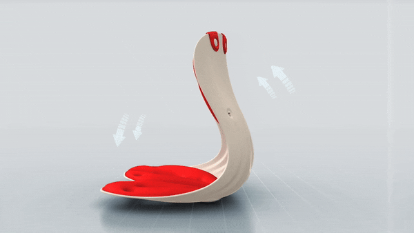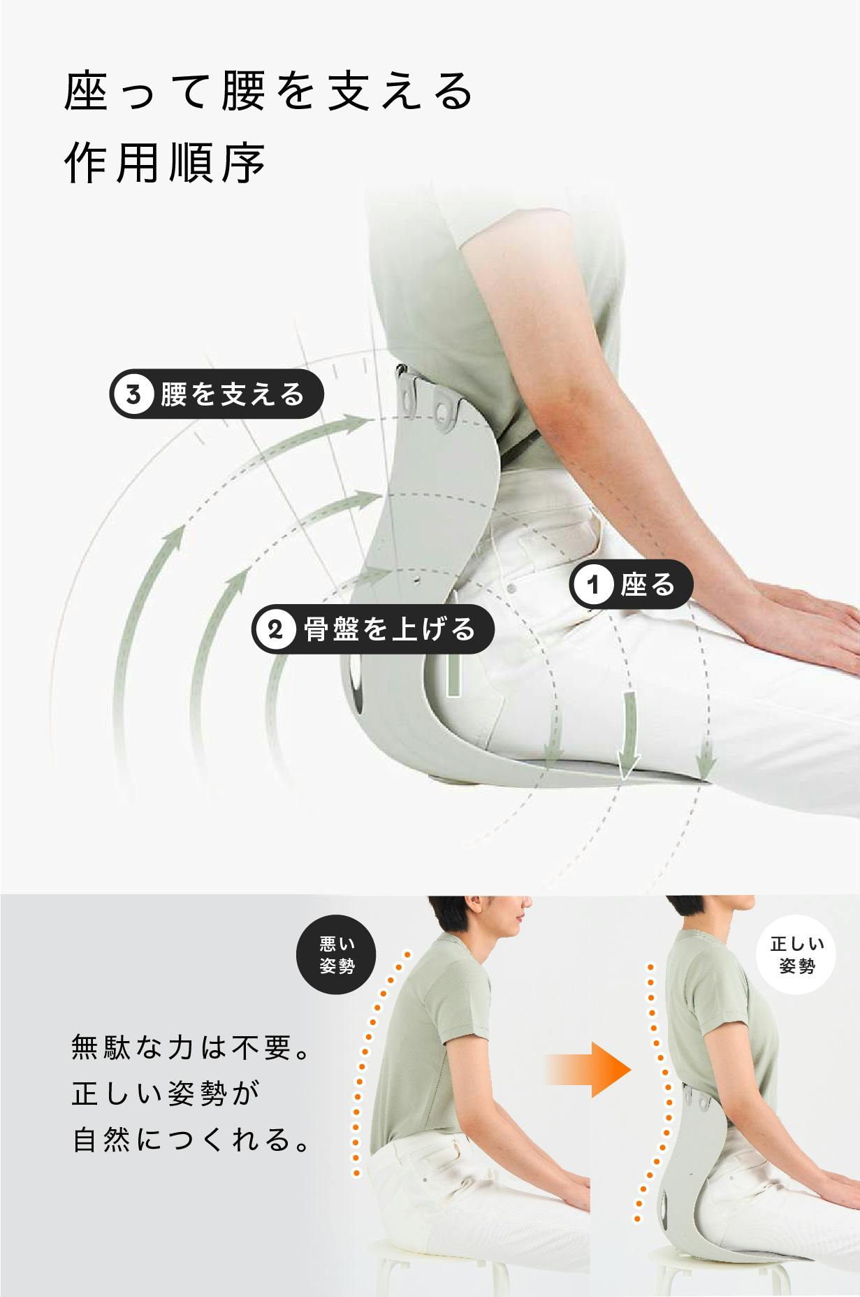 緩やかにカーブした底面が着座と同時に傾き、自身の体重によって骨盤を押し上げ、背もたれが腰周辺や背中を支えてくれる構造となっているので、座るだけで自然に理想の姿勢へ導いてくれます。