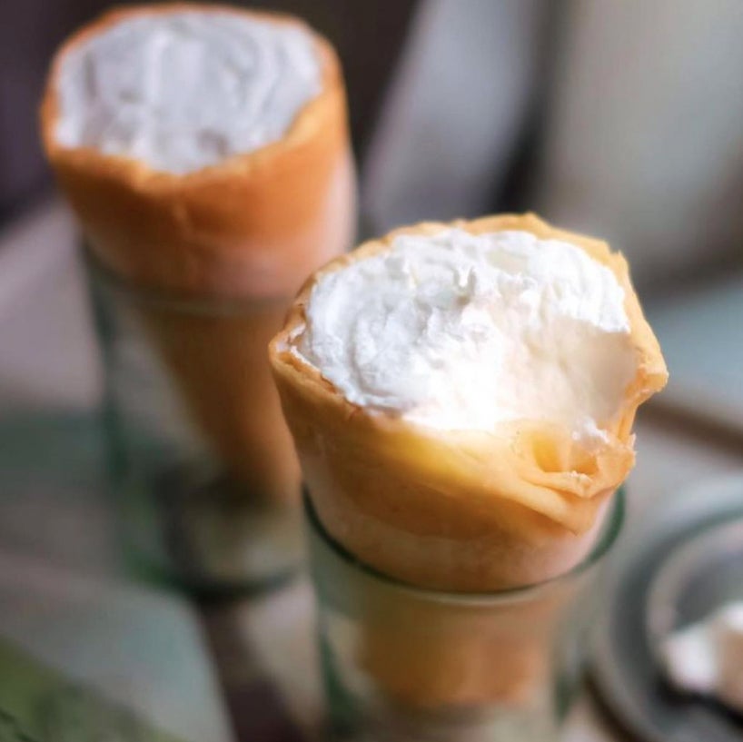 中にはミルクアイスと甘さ控えめなクリームがたっぷり詰まっており、もちもちのクレープ生地と一緒に食べることで上品な甘さに。