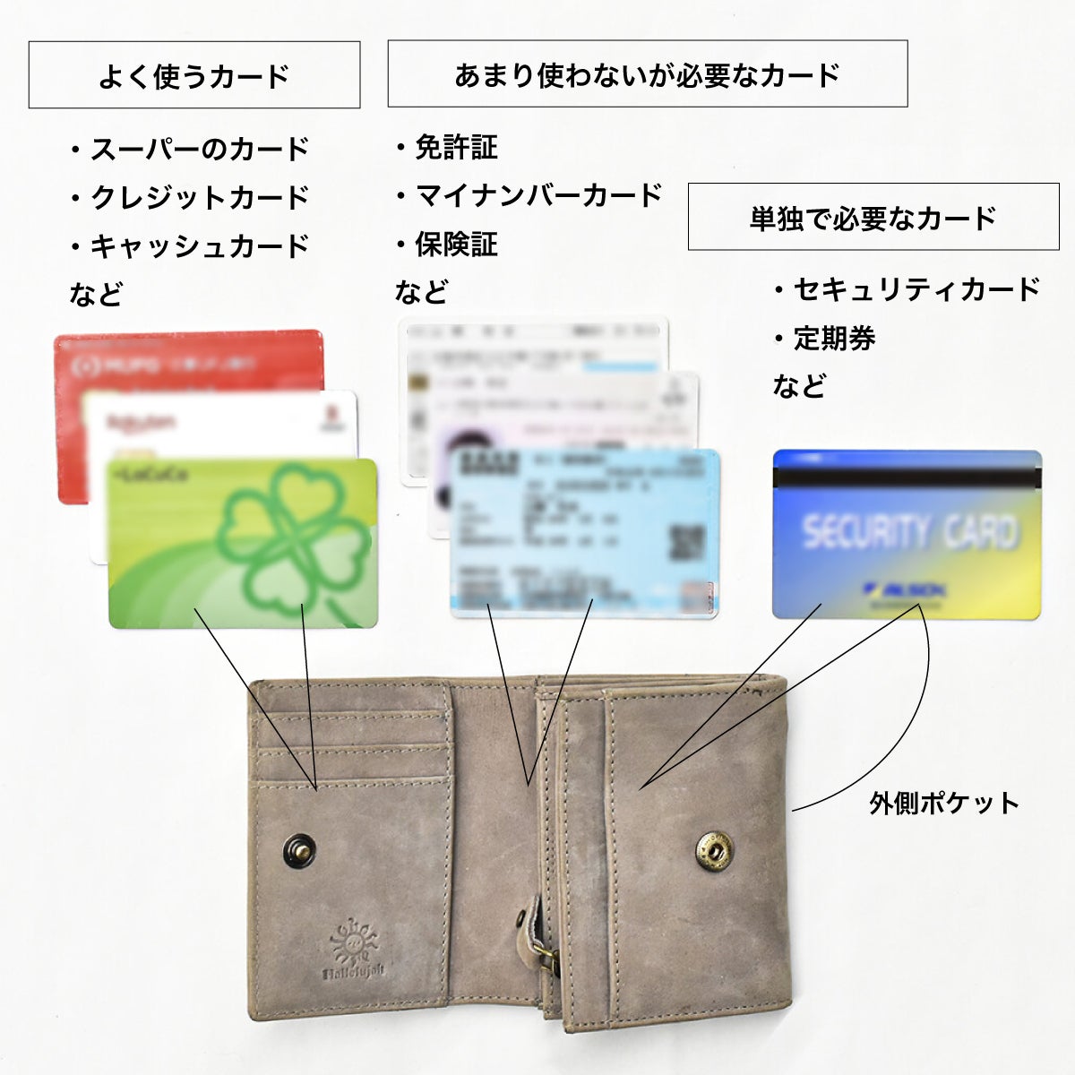 カード以外も収納できるサイズ違いのフリーポケットで、例えば常備薬や、メモ、お守りを入れておいたりと、あなたのライフスタイルに合わせた使い方ができます。