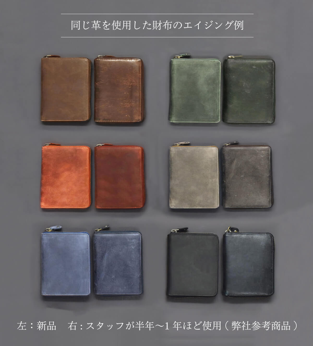 使い込むほどにツヤと深みが増していく様子は「革を育てる」という言葉がピッタリな、楽しみの一つです。