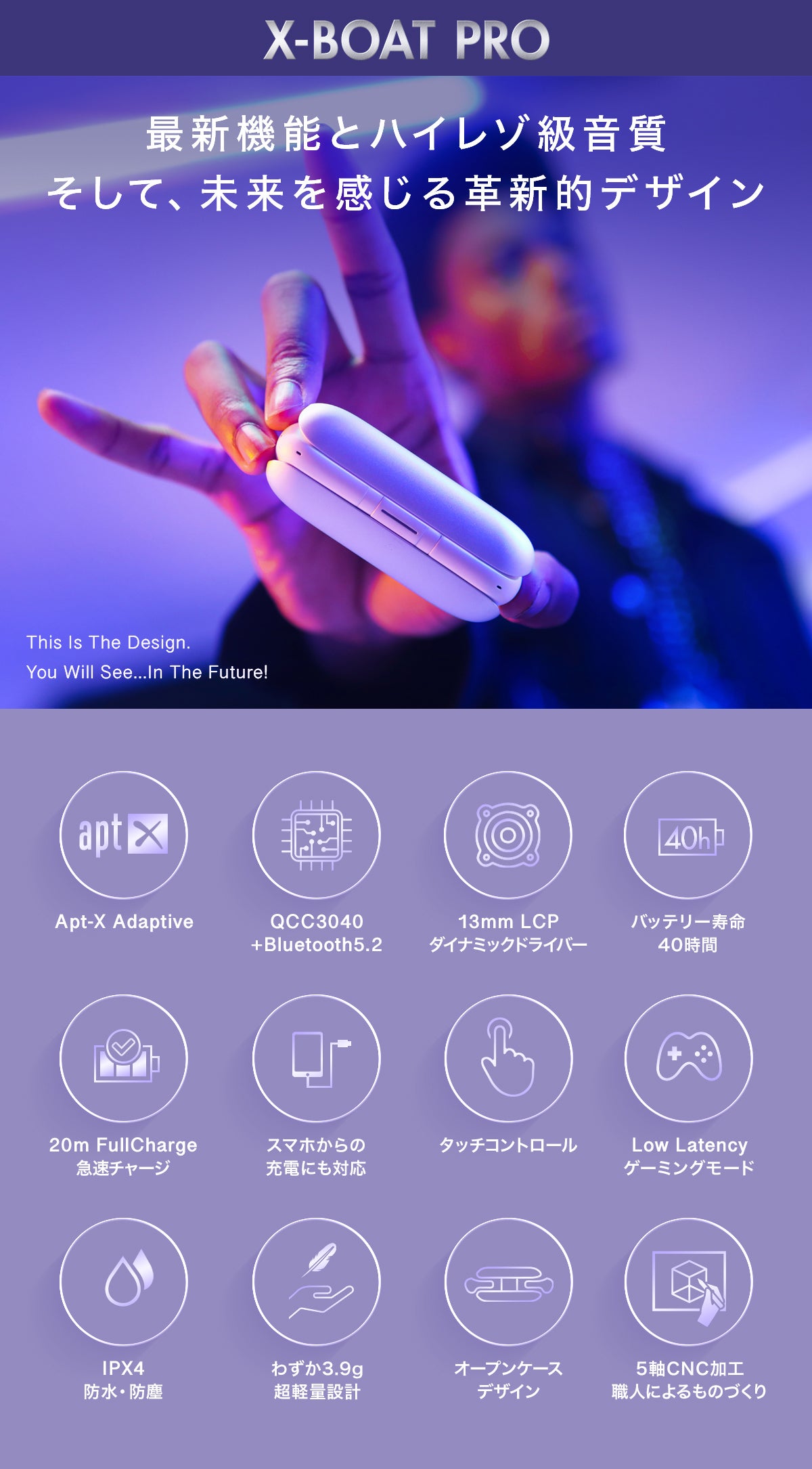 YOBYBOシリーズでは全てのモデルでモチーフとなる美しさがあり、それをイヤホンのデザインに落とし込んでおりますが、今回のX-BOAT PROにおける特長は「独自のイヤホンケースの構造」と「100%の流線型フォルム」です。