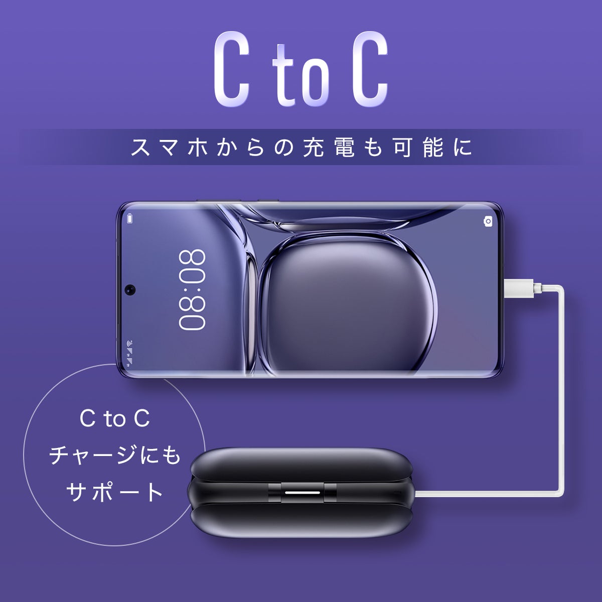 これまでYOBYBOシリーズのTWSイヤホンではType-A to Cのケーブルのみ、充電が可能でした。 しかし今作のX-BOAT PROではC to Cケーブルの充電もサポート!