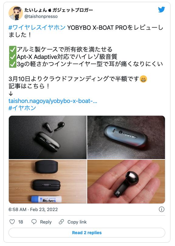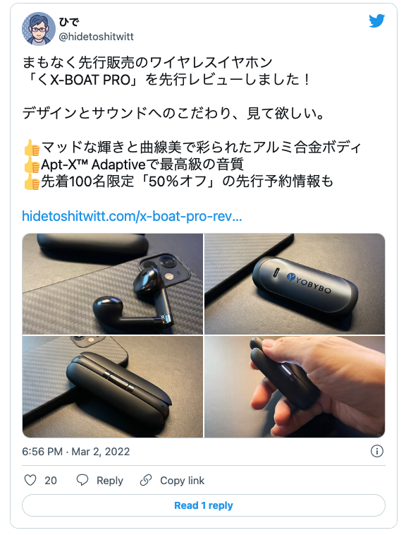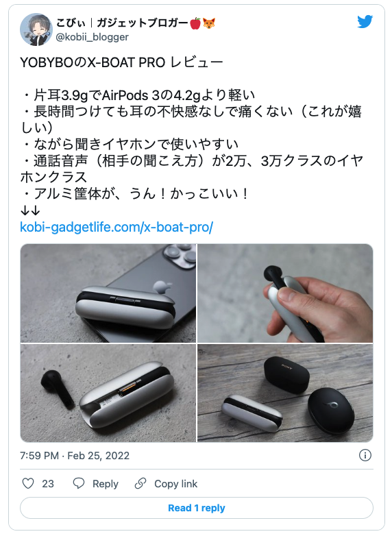 2022/08/05 11:15こんにちは、YOBYBO Japanです!先日お届けいたしました【X-BOAT Pro】の使い心地はいかがでしょうか?弊社公式サイトのレビューにて、たくさんのご感想をお寄せいただき誠にありがとうございます。まだレビューをご投稿いただいていないご支援者様も、ぜひご感想をご投稿いただけますと幸いです!レビューをご投稿いただいた方全員に、1,000円相当の【 3 in 1 USBマグネットケーブル 】をプレゼントしております♪☆レビューご投稿手順☆1.下記リンクからYOBYBO公式LINEにご登録ください。【YOBYBO公式LINE】2.ご登録後、レビュー投稿とレビュー投稿後のご案内が流れます。ご案内にそってご感想をご投稿ください。皆様からいただけるお声が、私たちの何よりの励みでございます。ぜひ、ご投稿をお待ちしております!今後ともYOBYBO Japanをどうぞよろしくお願い申し上げます。 もっと見る【強制ペアリング解除/リセット】につきまして