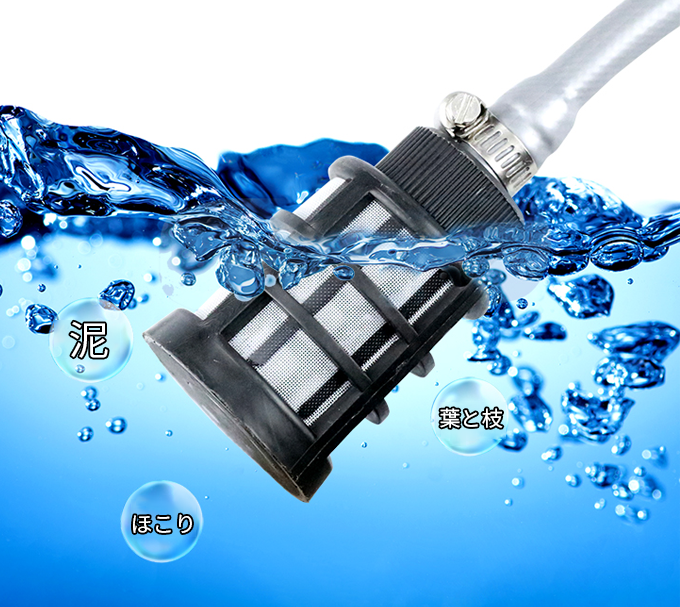 水を再利用する際の細かなゴミなどの不純物が混ざらないように、給水ホースにフィルターが搭載されています。