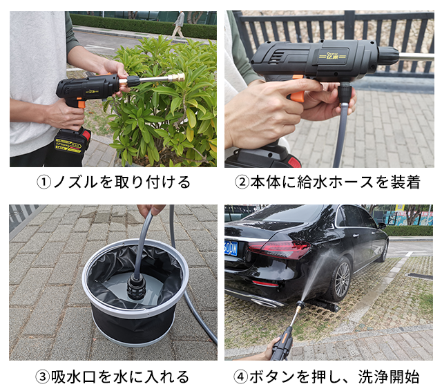 自吸式ホースの長さは6m、水を溜めたバケツやタンクなどに給水ホースを入れてボタンを押すと、水を吸い上げながら高圧洗浄できます。また、お風呂の残り湯や雨水も利用可能なので、お財布や環境にも優しいです。