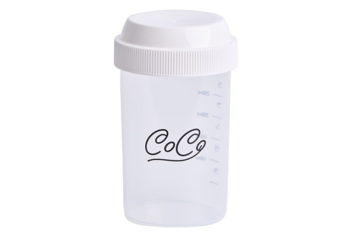 プロテインを美味しく飲むためのPia coco専用のシェイカー。350㎖の設計になっており、メモリにはPia cocoのマークが可愛く載っている。