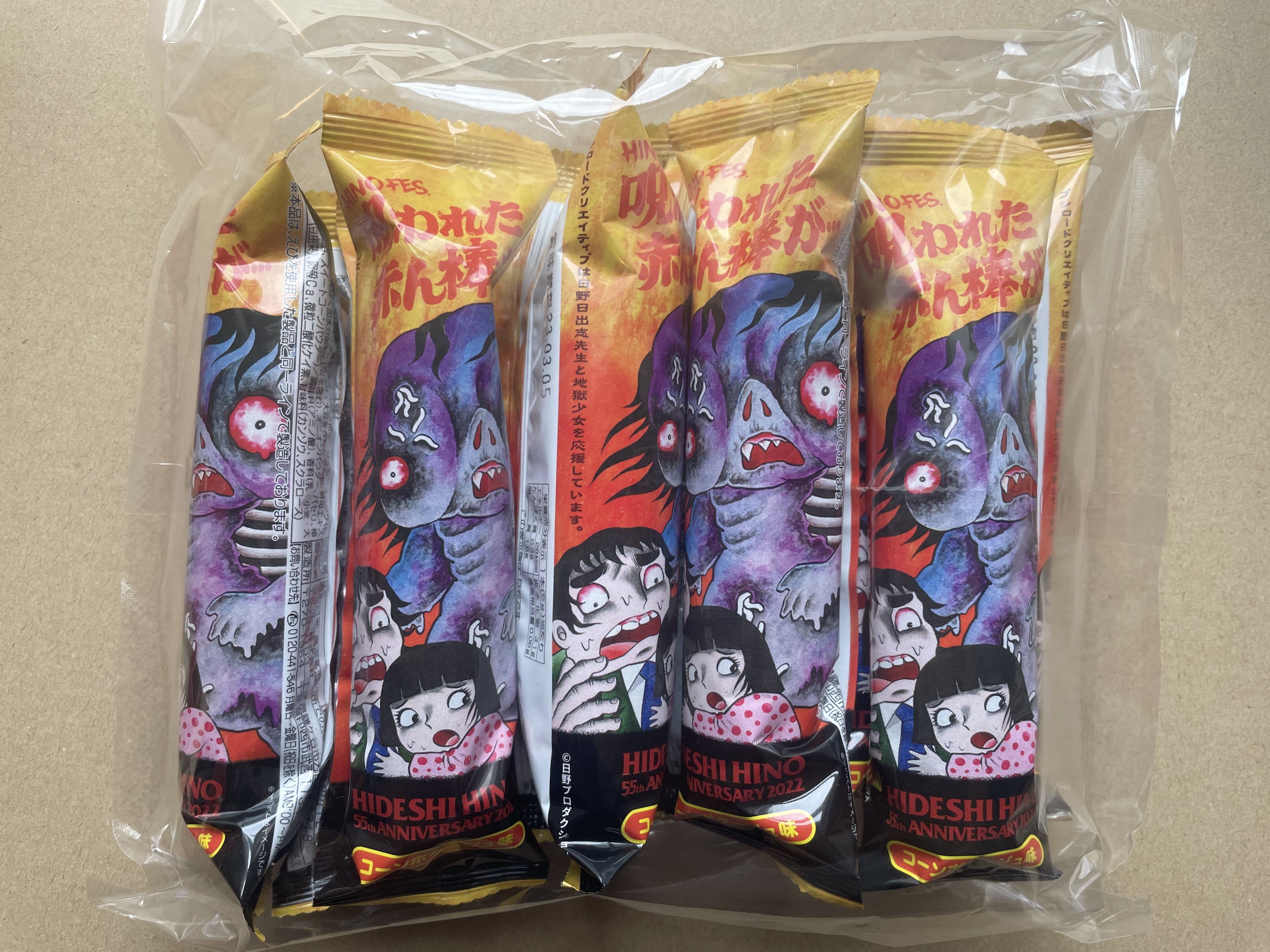 2022/09/23 12:51ご支援いただいた皆様、誠にありがとうございます。株式会社ブシロードクリエイティブ様に「お好きな日野作品のキャラクターを使用してオリジナルのスナック菓子を作れる権利」(55万円コース)を支援していただき「呪われた赤ん棒」が誕生いたしました。日野フェスで缶バッジガチャを設置して5回まわして下さったお客様に「呪われた赤ん棒」1袋プレゼントいたします。 もっと見る