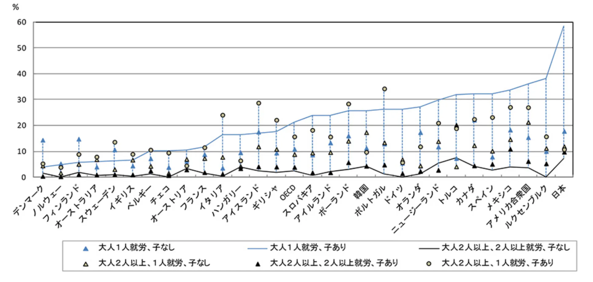 ”日本の相対的貧困層の8割は就業世帯である。OECD(2009)による世帯属性別ワーキングプア比率の国際比較をみると、日本のひとり親世帯のワーキングプア率は58%と突出している(図表3-29、図表3-30) ”