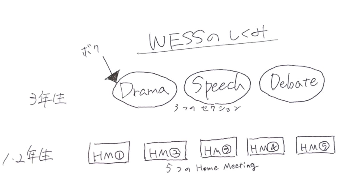 サークル全体での人数は約250名で、1・2年生は、5つのHome Meeting(HM)というクラスのようなグループで活動をし、3年生は、Speech、Debate、Dramaの3つのセクションに分かれて活動をしています。