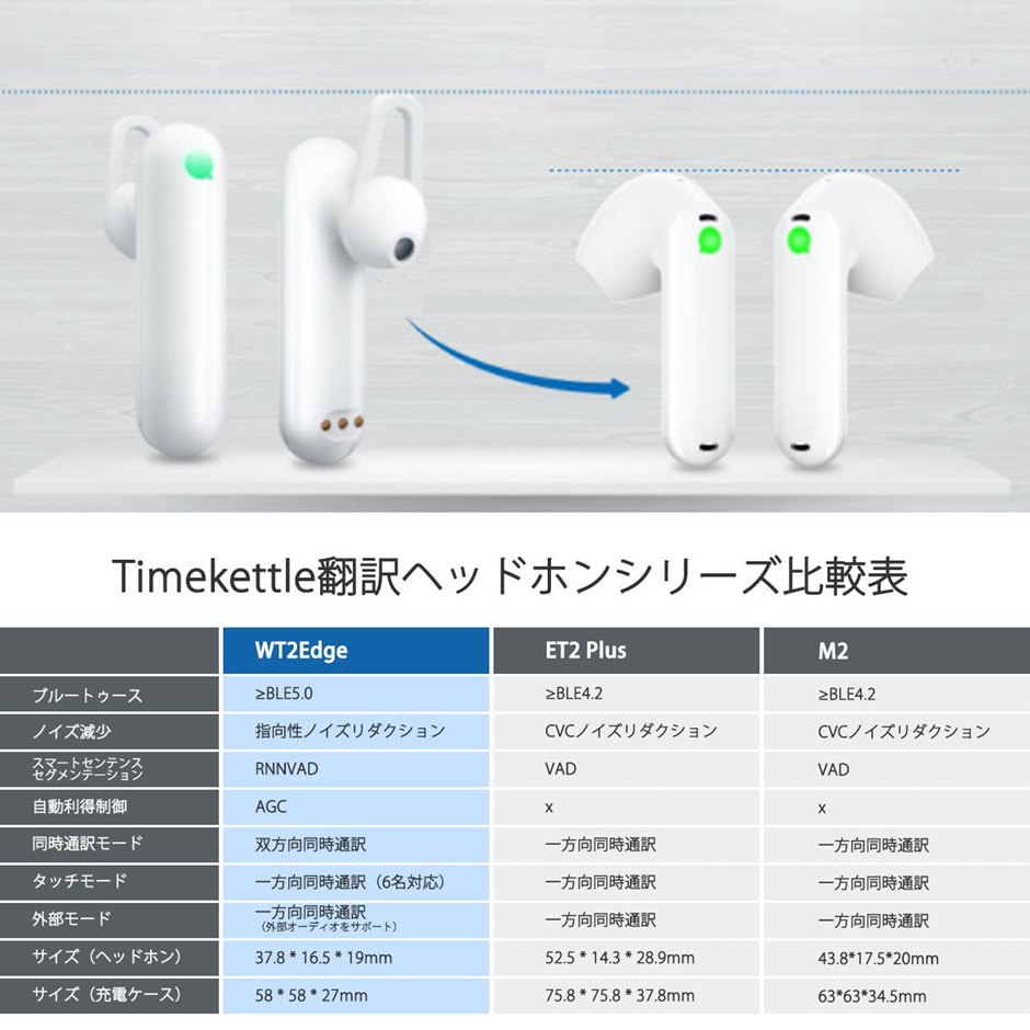 第一弾のイヤホン型翻訳機『WT2Plus』は、お互いがイヤホンをつけて話すだけでリアルタイム翻訳ができるという「翻訳」に特化したデバイス。「耳につける翻訳機」として注目を浴び、ECサイトAm社では2019年から2020年10月15日現在に至るまで、翻訳機ランキングのベストセラー翻訳機に選ばれ続けるなど、タイムケトルを代表する翻訳機です。
