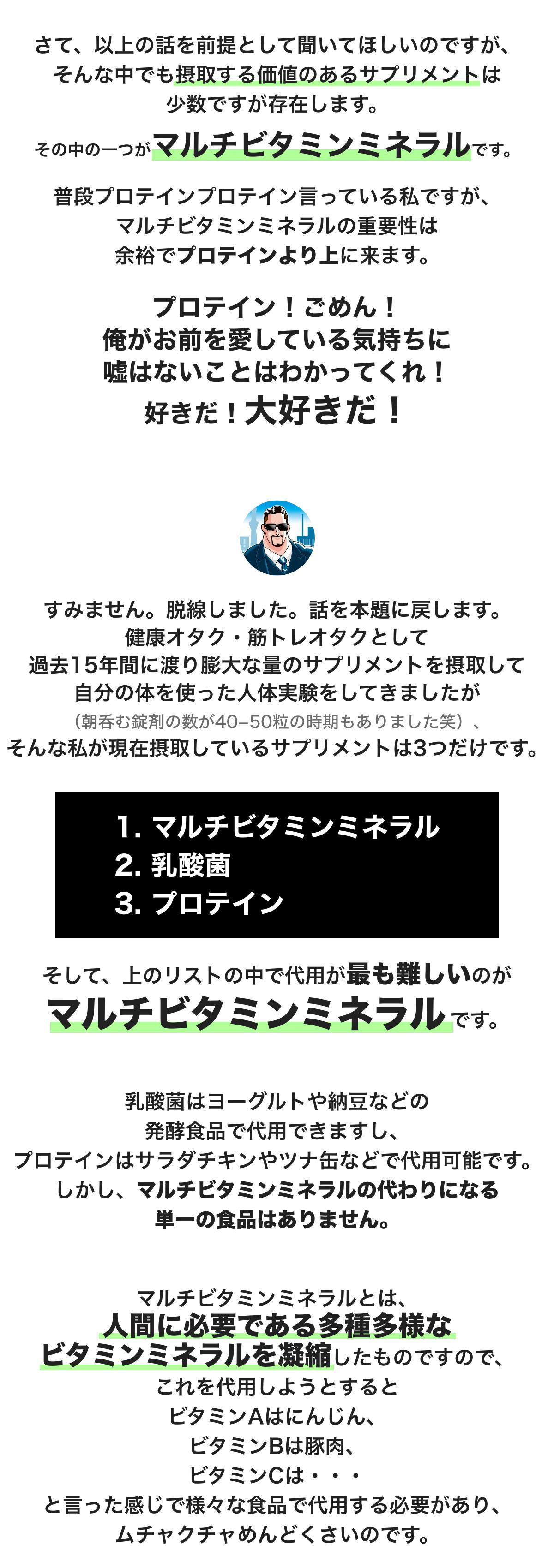 ・原材料名:乳酸菌(アメリカ製造、イタリア製造)、ダイダイ濃縮物、酵母、黒コショウエキス末/HPMC、結晶セルロース、加工デンプン、デュナリエラカロテン、トコトリエノール、ビタミンD3、(一部に乳成分・ゼラチン・オレンジを含む)