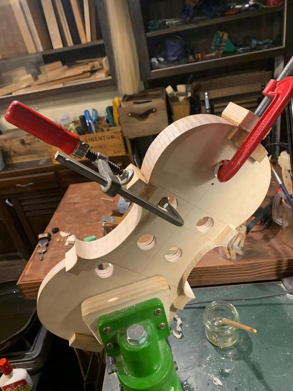 2023/01/13 15:00メープル材を薄板に加工し、熱を加えながら曲げて枠に合わせ、各ブロックに接着を行なっております。バイオリンのセンターバウツ付近のコーナーカーブはキツいため、折らないように曲げるのは大変難しい作業となります。 もっと見る