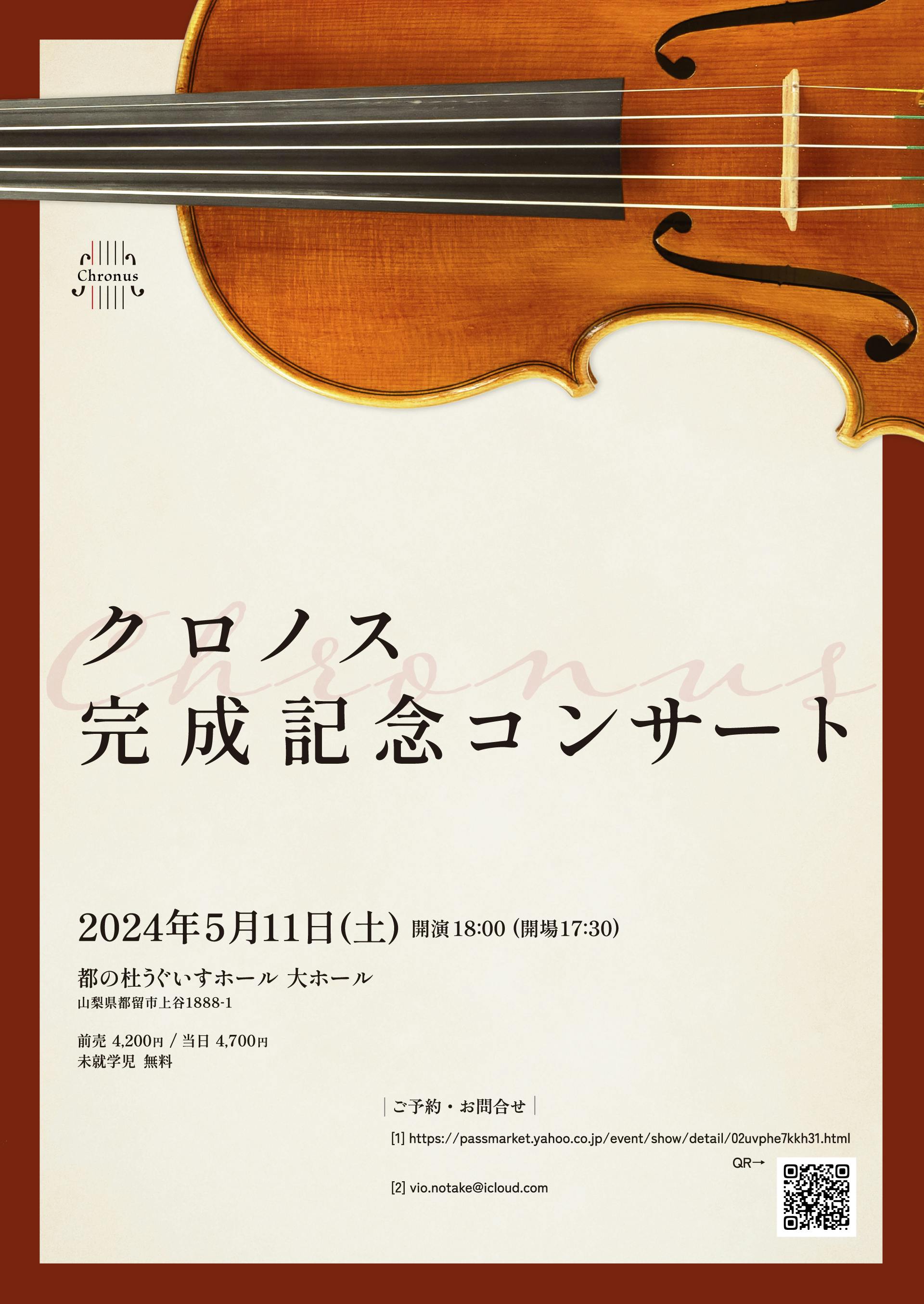 2024/01/27 23:00チラシ表チラシ裏皆様こんにちはクロノスプロジェクトプロジェクトオーナーの野武大誠です。ご支援をいただいた皆様にはメッセージをお送りいたしましたがクロノスが完成いたしました。たくさんの応援ありがとうございます。そして、いよいよクロノスの完成記念コンサートの詳細が決まりましたのでご連絡させていただきます。●日時2024年5月11日 土曜日開場17:30開演18:00●場所都の杜うぐいすホール 大ホール山梨県都留市上谷1888-1●料金前売 4,200円当日 4,700円未就学児無料●ご予約・お問あわせ電子チケットhttps://passmarket.yahoo.co.jp/event/show/detail/02uvphe7kkh31.htmlまたはvio.notake@icloud.com(ノタケ)※クラウドファンディング【クロノスプロジェクト】にご支援いただいた方には、「ご招待チケット」を郵送させていただきますので、チケット購入は必要ありません。なお、万が一「ご招待チケット」が2024年3月31日までに届かない場合は、野武までご連絡ください。※「ご招待チケット」は、1枚につき1名様のみご入場いただけます。お連れの方の分のチケットは別途ご購入をお願いいたします。皆様に嬉しいご報告ができてとても幸せです。完成とはいえ、クロノスはまだまだ発展途上です。これからいろいろな改良を加えていきます。しかし、現段階でも驚くべき性能を発揮しております。是非生の音を聴きにきてください!よろしくお願いいたします。野武大誠。 もっと見る【クロノス完成報告】