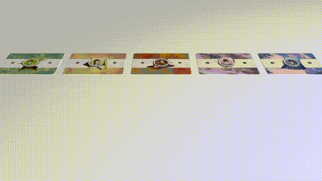 道具カードをシャッフルして両方のプレイヤーに6枚ずつ配ります。プレイヤーは順番にデッキから1枚の道具カードを引き、アクションタイルに描かれている4つのアクションのうちの1つを取ります。