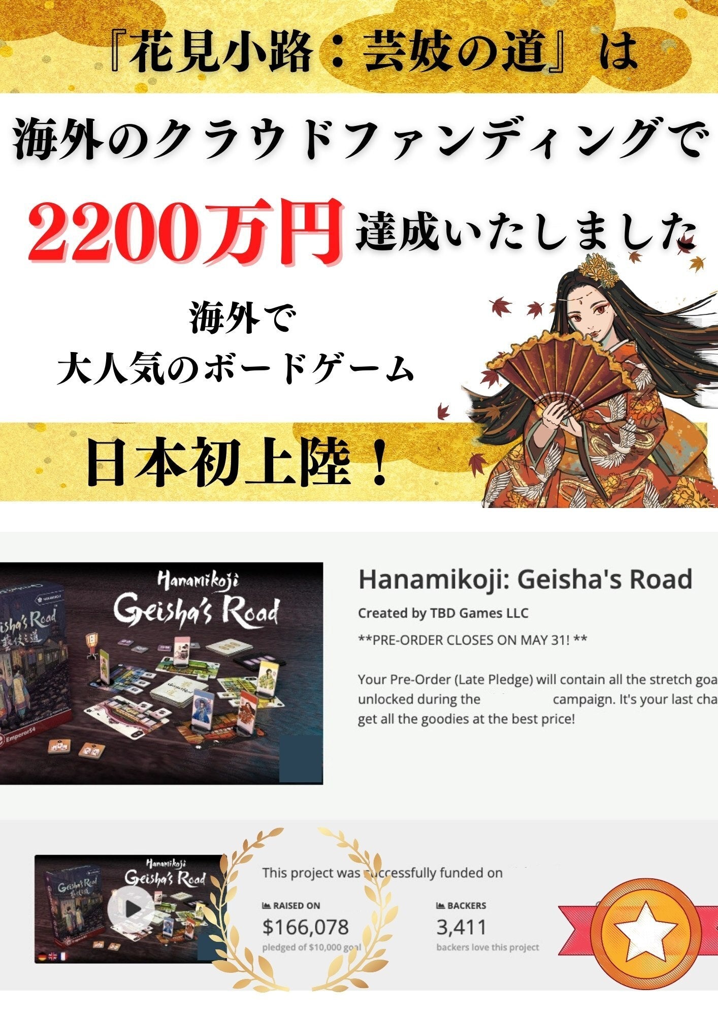 2022/09/29 19:00ご支援者の皆様ページをご覧の皆様お世話になっております。『花見小路:芸妓の道』が残り1日となりました。50名以上の方にご支援いただき、本当に嬉しく思っております。嬉しくて、昨日ボドゲの楽しさを教えてくれた先輩にも報告をしたのですが、、「すごいね!でもそれで満足せずに最後まで広める努力しないと。。50人はすごいけど、もっと多くの人がプレーしてもらわないと。。全国どこに行っても誰かと『花見小路:芸妓の道』が対戦できるまで頑張って広める努力をした方がいいよ」とお叱りを受けました。。またも努力不足を痛感しました!!全国のボドゲファンの皆様に知ってもらうだけでもいいので、『花見小路:芸妓の道』というボードゲームがある事を全国の皆様に知っていただきたいです!!これは理想ですが、どこの都道府県のボドゲカフェに行っても、『花見小路:芸妓の道』で対戦できるようにしたいです!!あと1日ですが、最後まで多くの人に知っていただけるように頑張りたいと思います。ツイッターでも投稿いたしますので、リツイートや拡散のご協力よろしくお願い申し上げます!!最後に、『花見小路:芸妓の道』は難易度も選べ、誰とでも楽しく遊んでいただけるボードゲームです。やればやるほど考えるポイントも増え、楽しめるゲームになってます!!是非、拡散のご協力よろしくお願い申し上げます!!『花見小路:芸妓の道』ツイッター もっと見る『花見小路:芸妓の道』残り6日となりました!