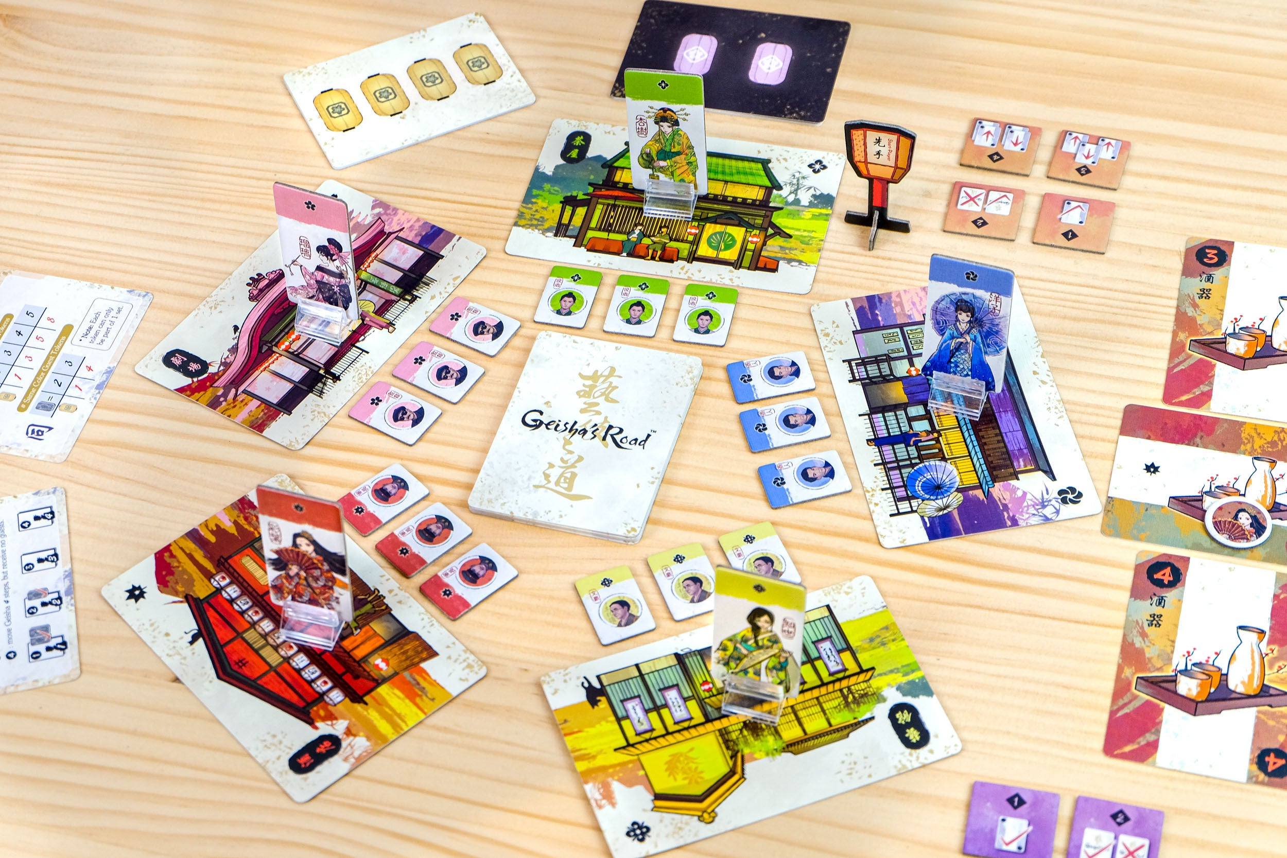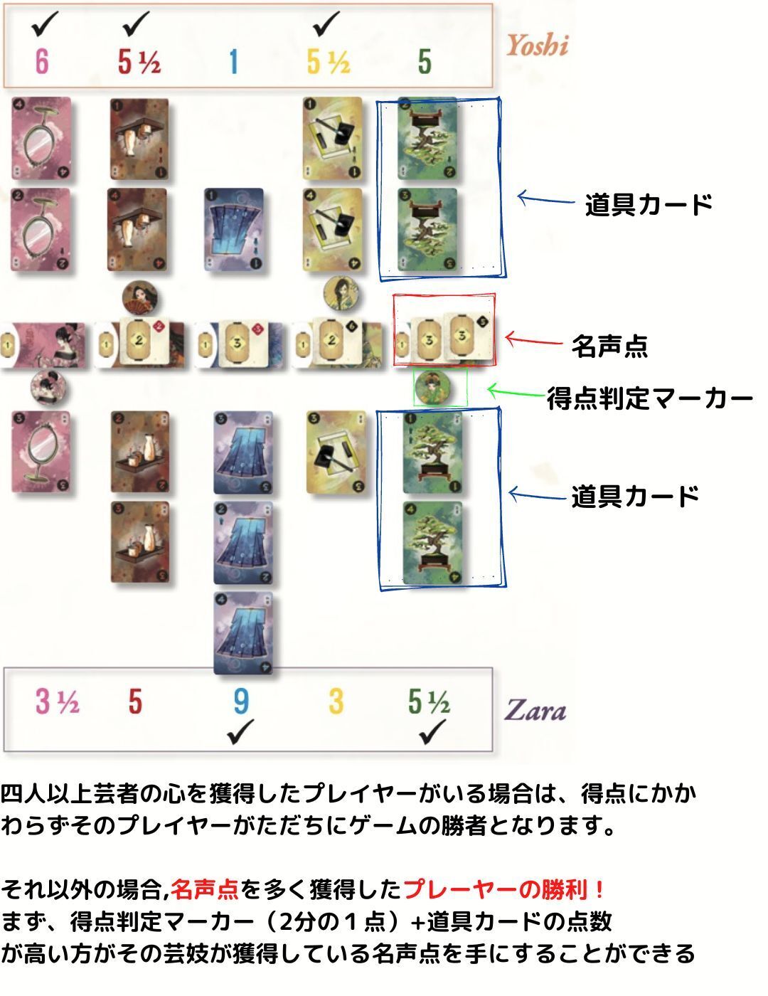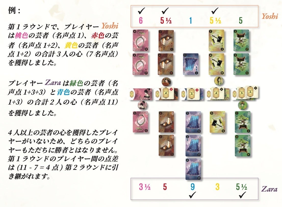 カードを使うことで、芸妓たちが施設を巡って客に芸を披露する手助けをします。芸妓たちは、自分の属する施設に戻ってくると名声を獲得します。4ターン後、各ラウンドの終了時に、各プレイヤーの影響力を比較し、どちらが芸妓の名声点を得るかを判定します。4人以上の芸者の心を獲得したプレイヤーがいる場合は、得点にかかわらず、そのプレイヤーがただちにゲームの勝者となります。それ以外の場合は、名声点がより高いプレイヤーが勝者となります。