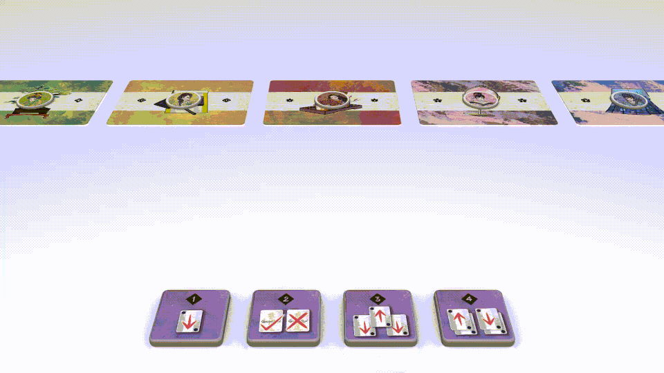• 相手はその道具カードの中から 1 枚選んで芸者タイルの手前に置き、対応する芸者を移動させます。 • 残った 2 枚のカードは手番プレイヤーが芸者タイルの手前に置き、 任意の順序で対応する芸者を移動させます。