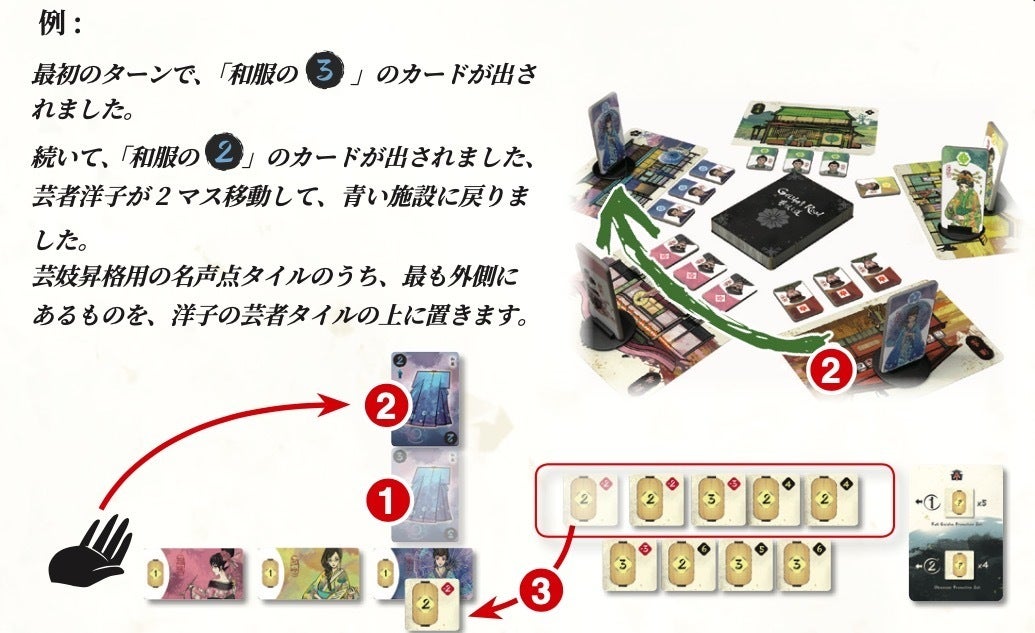 • 続いて、このアクションを選んだプレイヤーが残った 1 組のカー ドを芸者タイルの手前に置き、任意の順序で対応する芸者を移動させます。