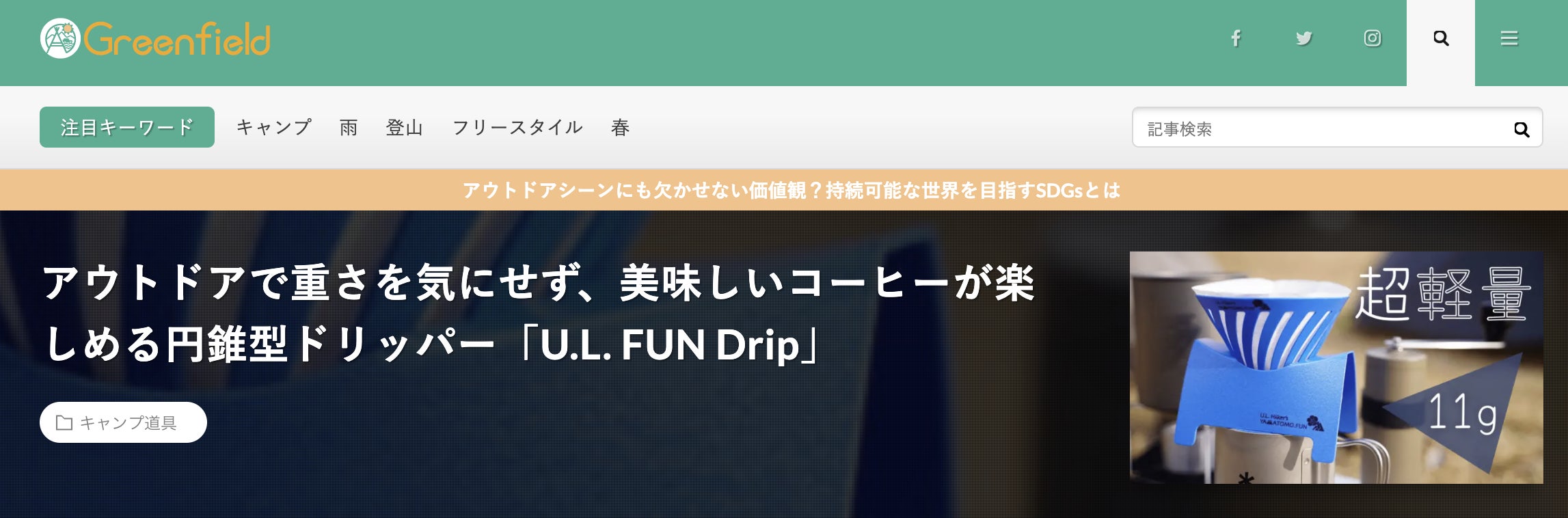 ● 日本のアウトドア、レジャースポーツ産業の発展を促進する事を目的とした総合ウェブメディア「Greenfield」で 【 U.L. FUN Drip 】が紹介されました。