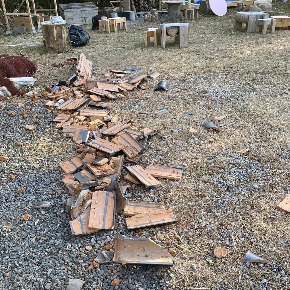 朝になって確認すると、屋根を止めている斜めの部分が4か所のうち2か所滑り落ち、瓦が散乱。屋根の一番上から瓦がずれているのが分かりました。