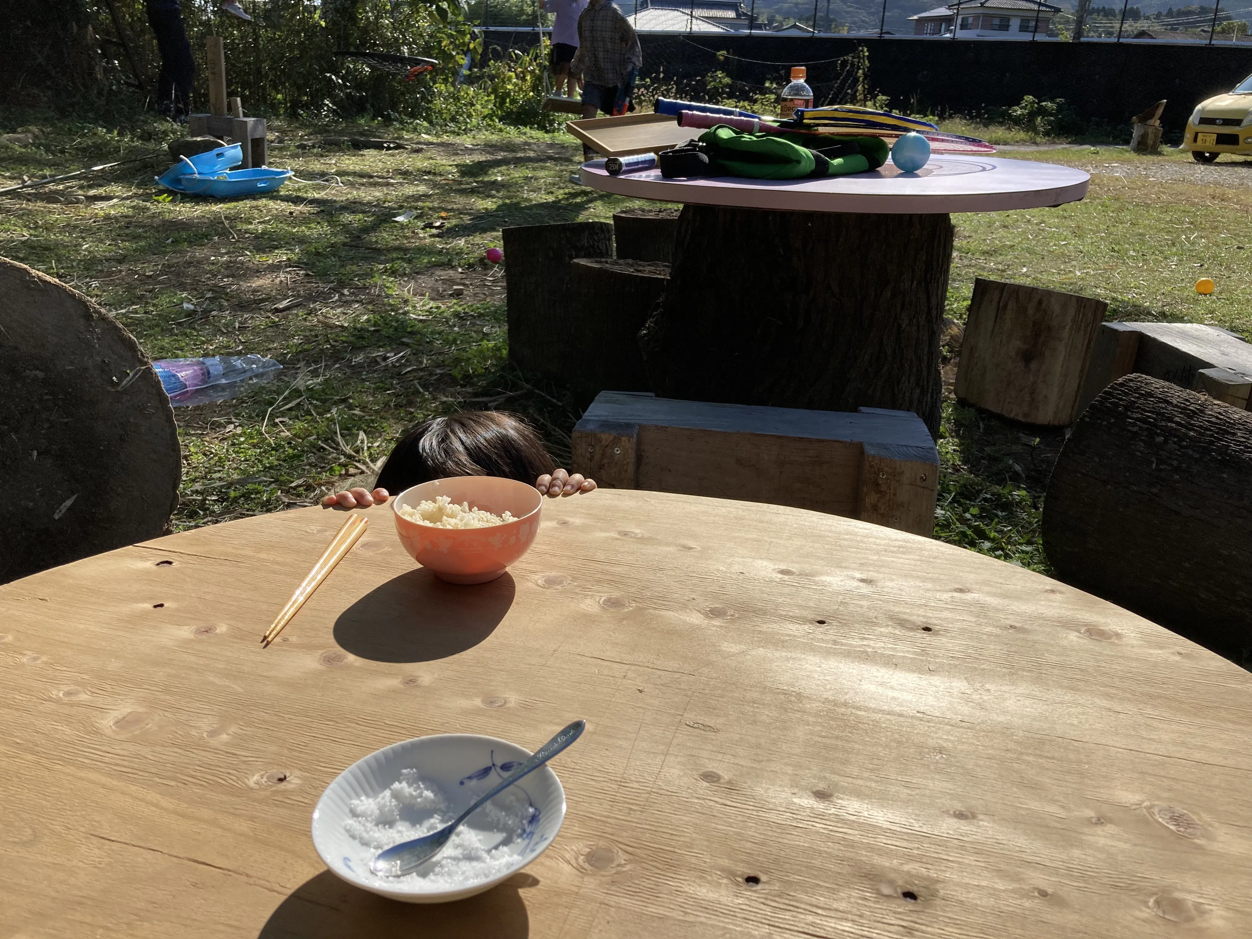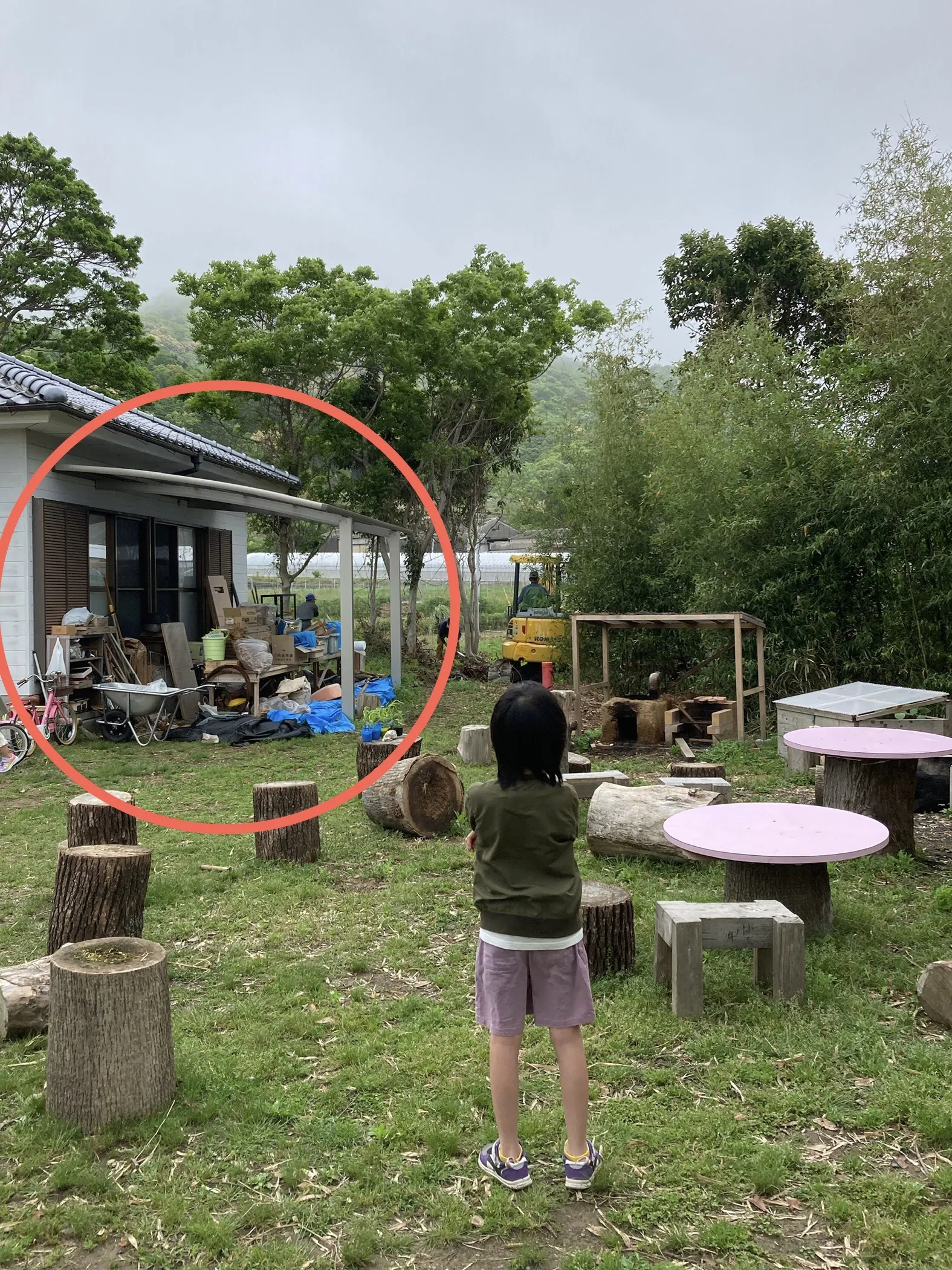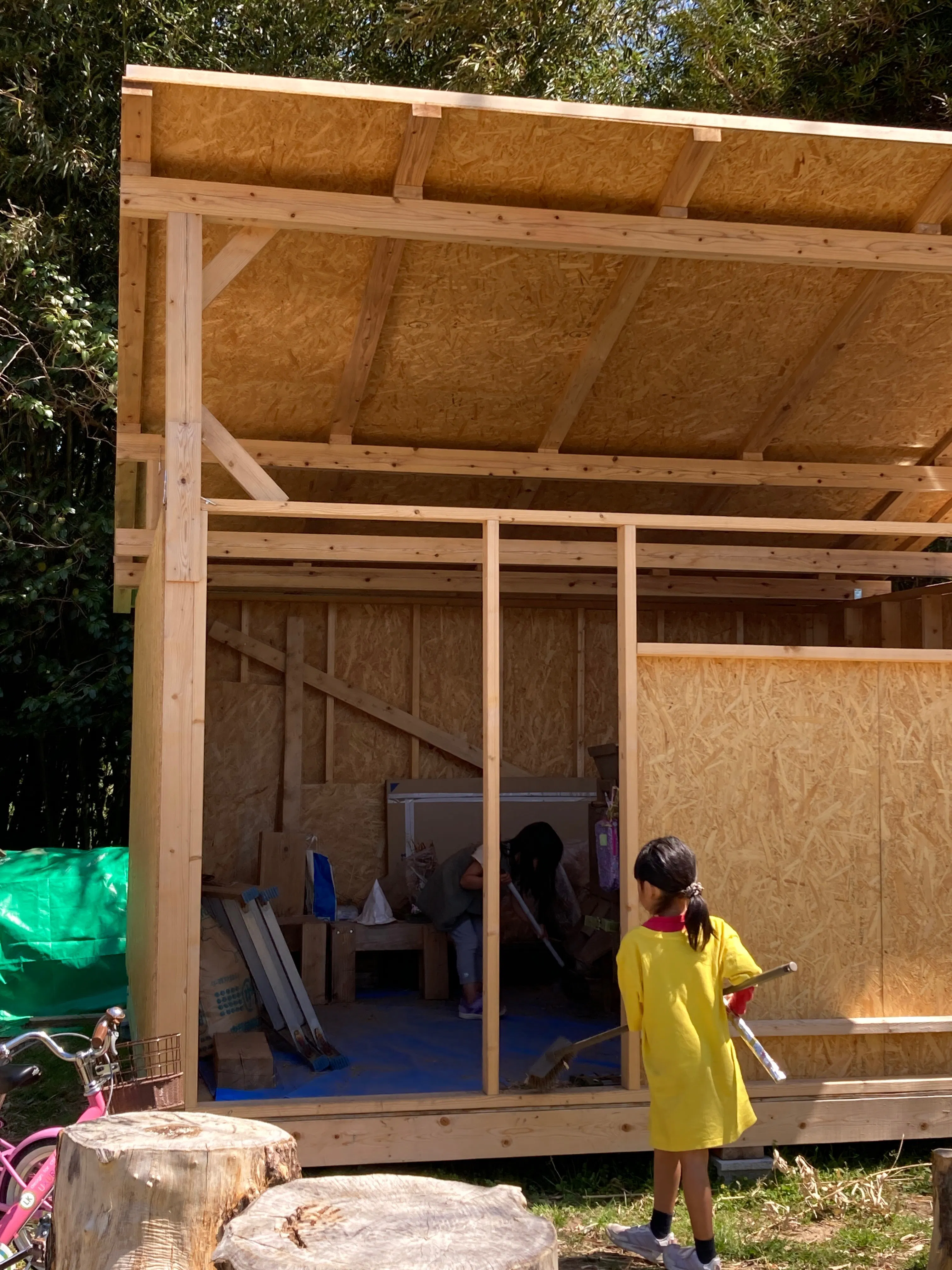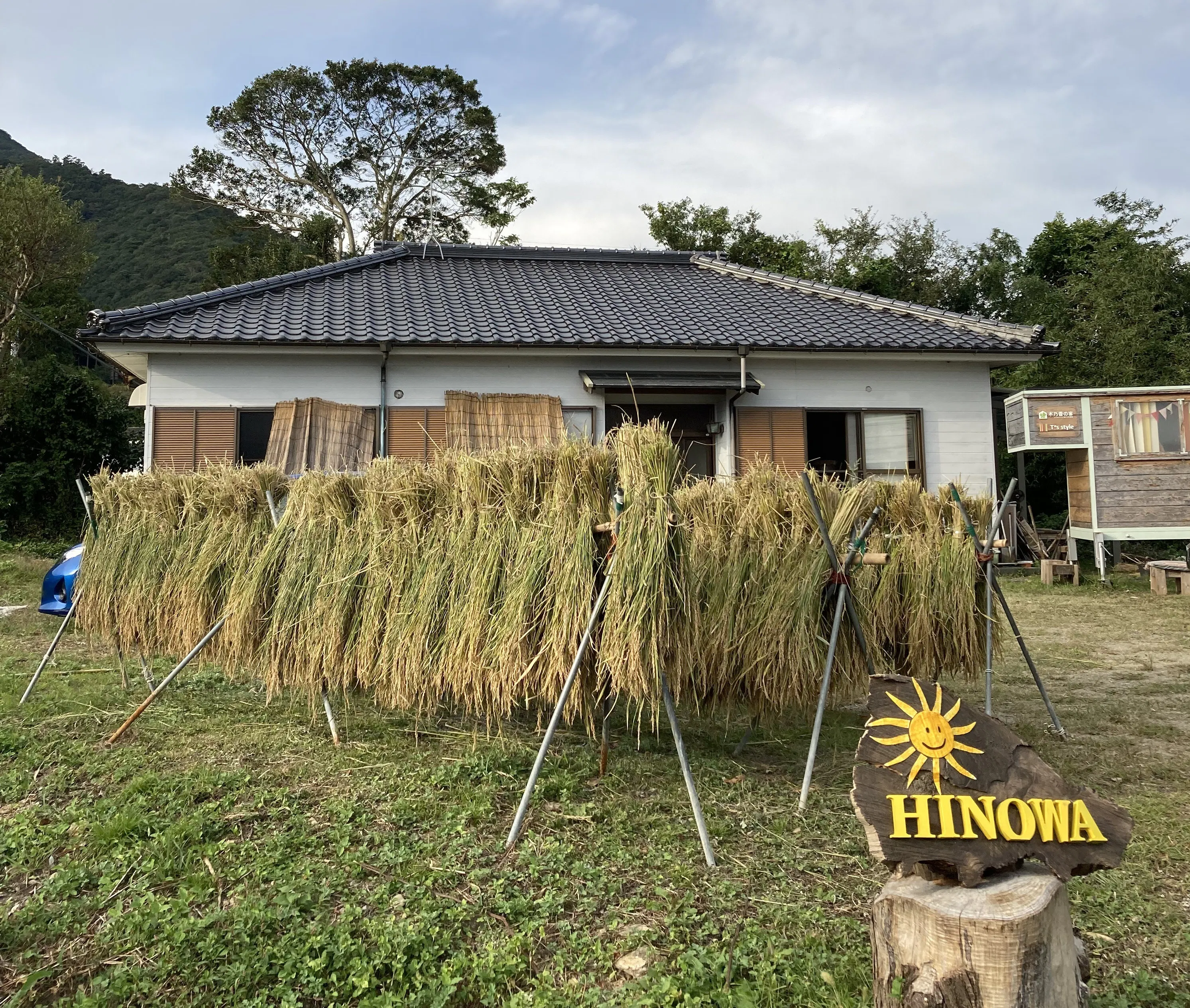 オープン時に新設したカーポートですが、耕す畑が広がり、米作りも始め、農作業用の道具が増えました。ヒノワっ子も増えて、道具をみんなが持てるように…と数も増えました。