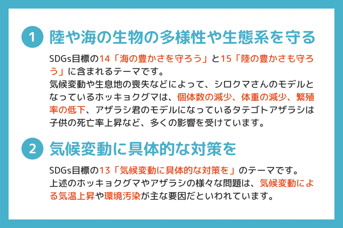 そして私たちは、この「恋するシロクマ」を通じて、北極で起きていること、シロクマさんやアザラシ君に迫る危機、SDGsが掲げる「生物の多様性」「気候変動」について、より多くの方に伝えたいと考えました。