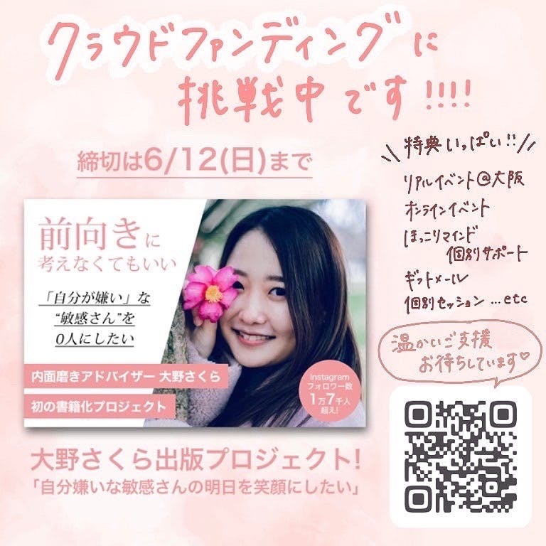 2022/06/01 20:31はじめましての方も、そうでない方も、こんにちは^^内面磨きアドバイザー 大野さくらと申します。いよいよ初めてのクラウドファンディングが開始され、1週間少し経ちました。すでに多数の方にご支援や温かい応援メッセージをいただき、本当に嬉しく思っています( ; ; )♡ありがとうございます♡以前から本を出版することが夢だったので、これは大きなチャンスでもあり、貴重な機会です。これもひとえに、いつも応援して頂いているあなたのおかげだと思っています。不安や緊張もまだまだありますが、みんなと一緒に!このプロジェクトを盛り上げていけたら嬉しいです♡私は元々繊細で落ち込みやすく、他人の目を過度に気にして疲れてしまう、いわゆる「敏感さん」でした。「HSP」とも言われるような、「病気ではないけれど生きづらい」気質を持って生きてきました。あなたももしかしたら、そんな私に共通点を感じてこれを読んでくださっているかもしれませんね。こうしてご縁をいただくことができたのも、あなたが私を見つけてくださったからだと思っています。私のような「生きづらい」を持った敏感さんでも、ちゃんと自分らしく幸せに生きることができます。生きづらいと感じる方ほど、大きくたくさんの想いを持っています。そんな方にほど…「ありのままを許して自分の人生を生きられるようになってほしい!」そんな想いで、日々たくさんの敏感さんと向き合っています。今回のプロジェクトが成功し、出版する書籍がたくさんの敏感さんの手に渡ることを心から願っています。ぜひ応援してください♡よろしくお願いいたします( ﹡ˆoˆ﹡ ) もっと見る