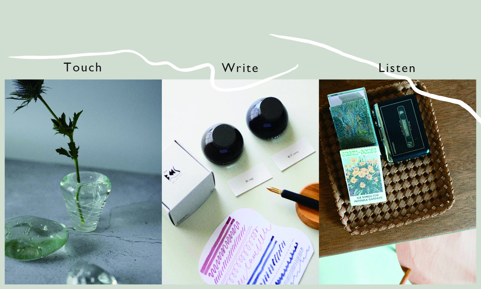 海や山など自然の景色を見て、思ったことを紙に書き出してみたり、音楽をゆっくり聴いてみたり、お香を焚いたり、お茶を淹れたり...日常的な情報と自分との共存の仕方を見直し、内在する自身の感覚に目を向けられる体験を提供します。