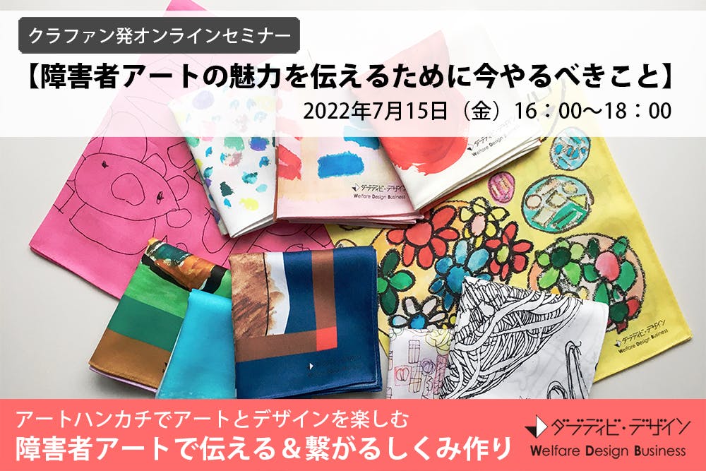2022/06/29 15:30ダブディビ・デザインの第二弾クラウドファンディング、【アートハンカチでアートとデザインを楽しむ★障害者アートで伝える&繋がるしくみ作り】のページをご覧いただき、ありがとうございます!今回のリターン品の中に、オンラインセミナー参加権というものがございます。その詳細が決まりましたので、こちらにてお知らせさせていただきます。************************************** クラファン発オンラインセミナー 【障害者アートの魅力を伝えるために今やるべきこと】 日 時:2022年7月15日(金)16:00~18:00 参加方法:zoomにて実施。 講 師:ダブディビ・デザイン 柊伸江 ゲ ス ト:エイブルアート・カンパニー様**************************************ーーー 主催者都合により日程が変更になっております。 ーーーーーー 参加者の皆様には個別にご連絡をお送りしております。 ーーー<セミナー概要>障害者アートの商品開発をテーマにしたオンラインセミナーです。障害のある方のアート作品をどのように発掘し、どのようにアレンジしているかや、企業とのコラボレーション企画はどんな風に進めているのか、また、福祉事業所様には日頃からどんなサポートやご準備をしていただくとよいかなど、実際の商品開発に即したノウハウをお話しさせていただきます。また、ゲストとしてエイブルアート・カンパニー様にもご登壇いただき、障害のあるアーティストを公募で選ぶしくみについてや、多くの企業との取り組み事例などもご紹介していただき、ダブディビ・デザインとは異なる部分の情報を補足していただこうと思います。講義90分、質疑応答30分の計120分を予定しています。※1つのアカウントでご覧いただけるようであれば、一つの画面を複数人で視聴していただいても問題ありません。※個人でのご購入、ご参加も大歓迎です。※限定30組までの購入制限を設けておりますので、お早めにお申し込みください。<申し込み方法>クラウドファンディングページにアクセスしていただき、「リターンを選ぶ」という欄から、「D-①【福祉事業所向け】オンラインセミナー参加権」を選択し、ご購入ください。参加費10,000円で、1アカウントで何名でもご視聴していただけます。申込期限:2022年6月29日(水)23:59◆領収書発行について◆領収書が必要な方は、ご連絡いただければ弊社で発行させていただきます。ダブディビ・デザイン柊までメールでご連絡をいただくか、クラウドファンディングCAMPFIREのページから、以下ページに沿ってご依頼ください。https://help.camp-fire.jp/hc/ja/articles/230679808-%E9%A0%98%E5%8F%8E%E6%9B%B8%E3%82%92%E7%99%BA%E8%A1%8C%E3%81%97%E3%81%A6%E3%81%BB%E3%81%97%E3%81%84◎サイト内のメッセージ機能をご利用のうえ、起案者に直接領収書の発行をご依頼ください。1)CAMPFIREへログイン2)マイページ「受信したメッセージ」を確認3)「メッセージ新規作成」を選択4)「支援者になっているプロジェクトから選ぶ」一覧にて該当のプロジェクトの「選択」ボタンを押す5)メッセージを入力、送信<問い合わせ>本セミナーに関するお問い合わせは、ダブディビ・デザインまでお願いいたします。E-mail contact@dabudivi.com もっと見る