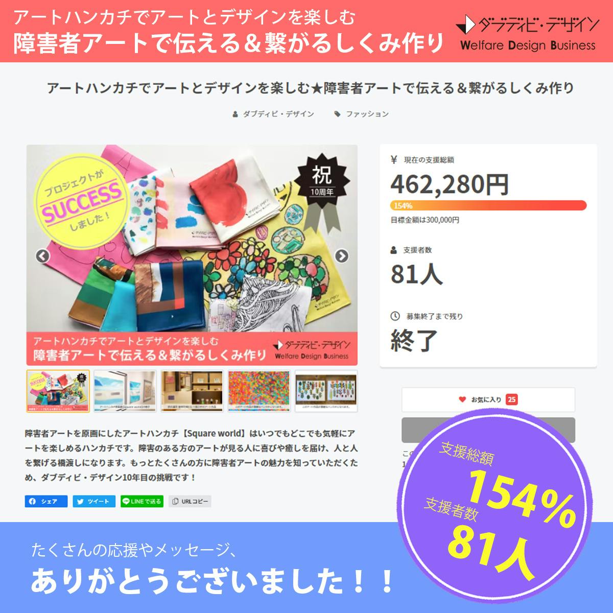 2022/06/30 08:00ダブディビ・デザインの第二弾クラウドファンディング、【アートハンカチでアートとデザインを楽しむ★障害者アートで伝える&繋がるしくみ作り】のページをご覧いただき、ありがとうございます!皆様からのたくさんのご支援のおかげで、無事、プロジェクトがSUCCESSし、募集期間が終了しました!皆様、応援ありがとうございました♪♪支援総額は目標金額の154%の462,280円!支援者数81人!という多くのご支援を頂戴しました。多くのメッセージやご連絡も頂戴し、皆様に感謝申し上げます。準備不足もあり、皆様にきちんと情報がお届けできなかったこともあったかと思います。これからも、活動報告ページから進捗状況はお知らせいたしますので、またページをのぞいていただけますと幸いです。このアートハンカチプロジェクトは、もっともっと広げていきたいと考えています。是非、これからも応援をお願いできれば幸いです。引き続き、どうぞよろしくお願いいたします♪ もっと見る