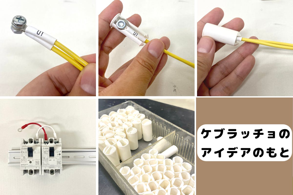 2022/06/30 10:56こんにちは!ケブラッチョのプロジェクトオーナー、五色電機 広報担当 おしんです。お気に入り登録いただき、ありがとうございます。今回は、今まであまり説明してこなかった、ケブラッチョのアイデアを思い付いたきっかけとなった部品について初公開したいと思います!あえて隠していたというわけではないのですが、なかなか説明が面倒だったのと、頑張って説明しても「なるほどー!」と思ってもらうのは難しそうだったので、あまり説明してきませんでした。もしご興味あればこちらも読んでみてください。制御盤の基本は、部品to部品の配線制御盤の配線をする上での基本のお作法として、部品から部品へ、「継ぎ足さずに1本の電線で配線をする」という考え方があります。電線が短くなったから、途中で電線を継ぎ足すのは原則NG、という意味です。なので、配線したい部品に向かって、おおよその電線の長さを目測で測りながら、電線をカットし、配線しています。いかに素早く長さを決めて配線するかも、職人の腕のひとつです。万が一電線の長さが足りなかったら、やり直しです。※ちなみに、これが自宅やビルといった電気工事になるとまた話は変わります。自宅の中を通すのに必要な電線の長さを測るのは大変ですし、多芯ケーブルを使うという事情もあって、基本的に中継ボックスというところで電線は全て継ぎ足すというか、結線しなおします。第二種電気工事士という資格を取得したのですが、勉強しはじめの頃、この感覚が分からなくて「え?え???なんで部品に到達してないのに結線し直すの??」と混乱していました。(笑)ですが例外もあって、部品から直接電線が生えている(付け替えができない)ような場合は、そもそも電線の長さが足りないことがあります。そんなときは、電線を継ぎ足して配線したりします。電線を継ぎ足すための部品継ぎ足すための部品はいくつか種類があるのですが、そのひとつが↓の写真のものです。(本来の用途は、継ぎ足すためというより、電線を絶縁保護するキャップです)電線をネジでつなぎ合わせ、溝にはめてカバーをすることで、導電部が隠れ、感電やショートが起こらないようにしています。ちょうど今年の3月頃に、事情があって現場でこの部品を使って仮配線していたものを引き上げてきたので、かれこれ20~30個ほど、ひたすらネジを回してこの部品を分解し、片付けていました。そのときにひらめいたのが、「この部品みたいに、ネジで電線をつないだら面白そう!」という、ケブラッチョのアイデアです。ふだんの制御盤ではやらないことなんです。これはきっと面白そう!と思って、その日の晩のうちにノートにアイデアを書き出しました。そこから名前を考えて、製品の形を作って、ロゴやデザインを考えてと走り出し、今に至ります。というわけでケブラッチョは生まれてたった3ヵ月ですが、クラウドファンディングの活動を通して、沢山の方に知って頂けて、とても幸せです。今日はいよいよ最終日。このあと、もう一本活動報告書きますね! もっと見る