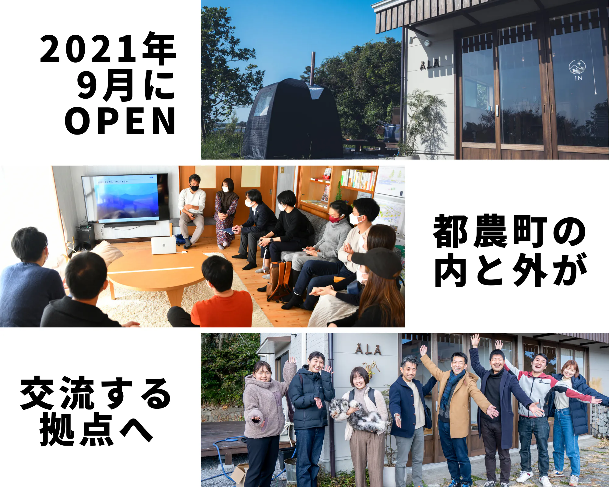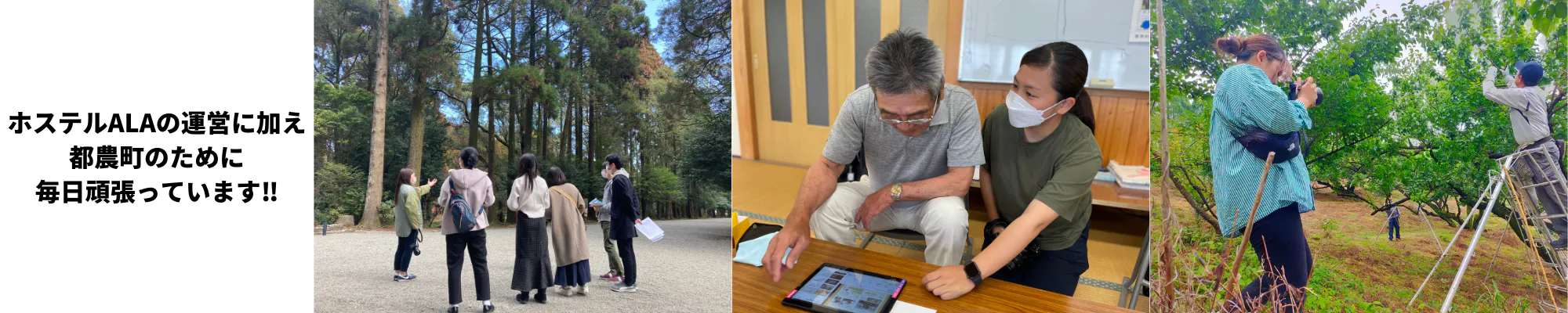 はじめまして。人口1万人の町、宮崎県都農町(つのちょう)に在住している黒木翼と渡邊佳です。私達は現在まちづくりホステルALAを運営しています。まちづくりホステルALAは、空き家と耕作放棄地だった場所を、町内の人と町外の人が都農町のまちづくりを一緒に考えられる場が欲しいという想いから出来ました。今では他所で普段からまちづくりに携わる方や、日本一周中の旅人、旅しながら働いている会社員など様々な背景の方がやって来ています。