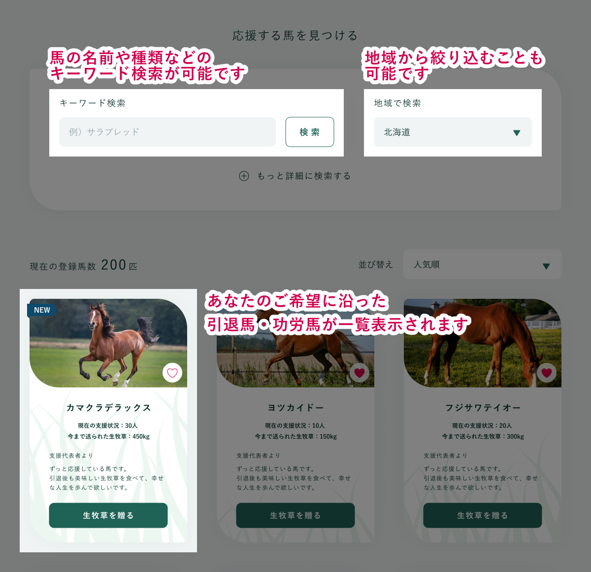 ①誰でも簡単に、応援したい馬を探して生牧草を贈れます。