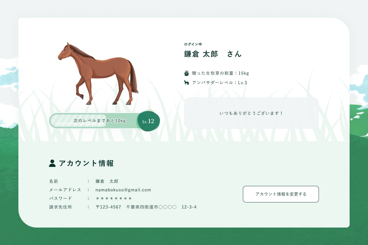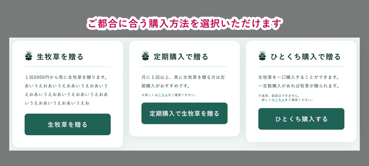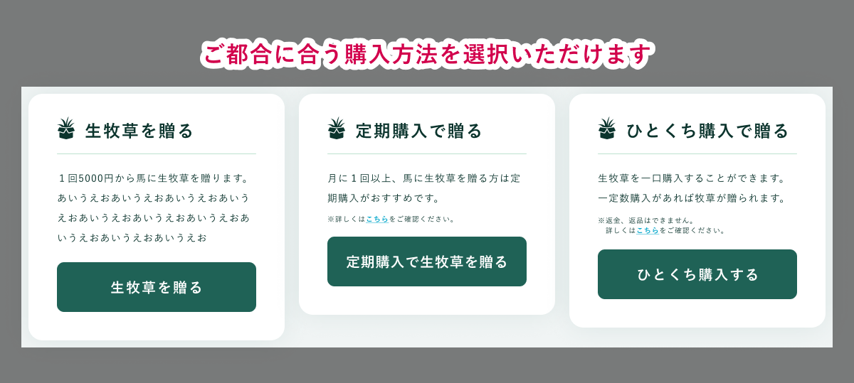 馬が本当に喜ぶ生牧草を贈ることで馬も応援してくださる方も笑顔になってほしいという気持ちを込めたものです。