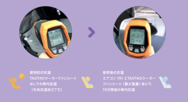※エアコンとクーラーファンシートを最大風量にして組み合わせしています。計測は、人が乗っていない環境で行なっておりますので、人が乗っている条件ですと、結果が異なります。