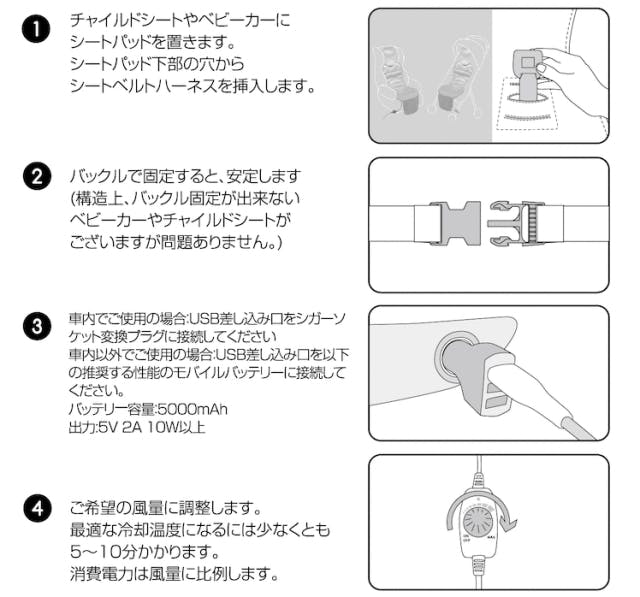 ベビーカー・チャイルドシートに付属しているインナークッション等を利用している場合には取り外し設置していただくか、TAOTAOクーラーファンシートと併用する場合には、お子さまの安全を最優先にご利用をお願いいたします。