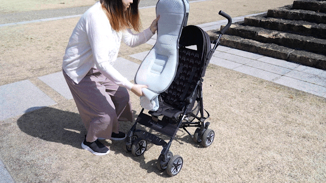 また、シートにはさまざまなサイズのチャイルドシート・ベビーカーに取り付けられるよう3つの穴が空いており、シートを適切な位置で固定できます。