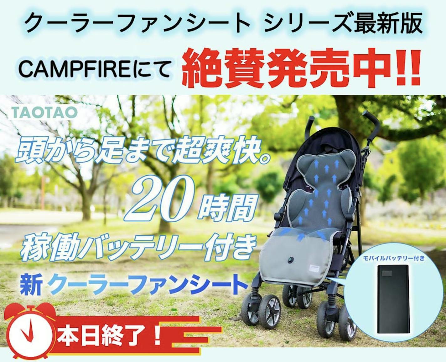 • こんにちは、TAOTAOストアーです!今週末で全国的に梅雨明けしてきまして、本格的な夏の時期が到来してきましたね! ただいま実施中のベビークーラーファンシート最新版の割引キャンペーンですが、明日で終了となりました! 梅雨明けして以降、皆様から、予想以上の反響をいただきまして、一部のリターンについて売り切れ状態となっておりましたが、本日急遽、追加リターンを用意しまして、オトクな価格でのご購入が可能な状態となっております! またすべてのリターンが、7月中にお届けが可能となっております!7/22の23:59を過ぎると、しばらくは割引価格での販売を行いませんので、またとないこのチャンスをお見逃しないよういただけましたらと思います。商品ページ:https://camp-fire.jp/projects/758069またペット用クラーファンシートの割引キャンペーンも同時開催中です!こちらも7/22までですので、ご興味あるかたはチェックお願いします!商品ページ:https://camp-fire.jp/projects/758070 もっと見る