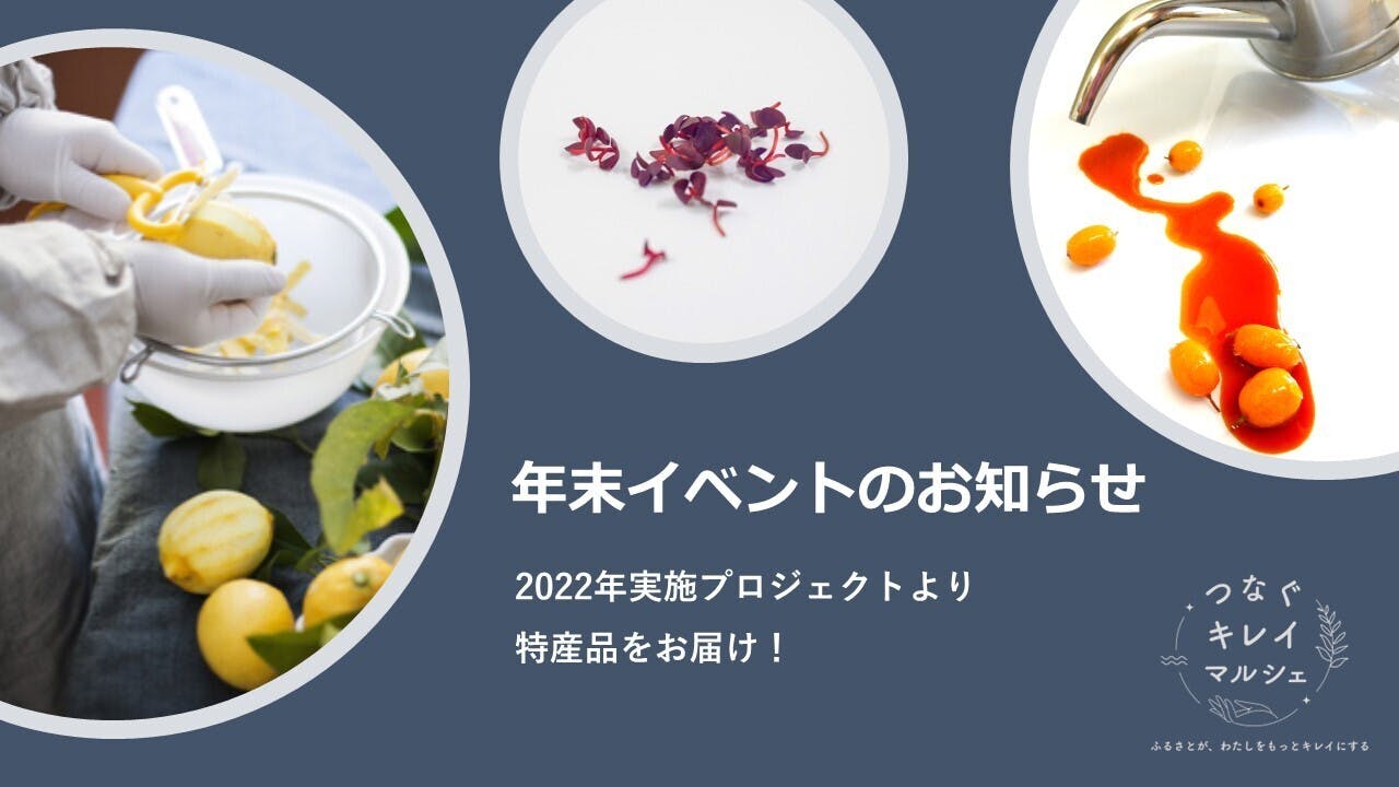 2022/11/25 11:30本日締切としておりました年末イベントですが、多くの方にご希望をいただいております!そこで、参加締め切りを11月30日(水)23:59までに延長します!まだアンケートにご回答いただいていない方は、是非ご参加ください。年末イベントのご案内2022年度実施したプロジェクト、3つの地域に関わる産品詰め合わせセットを、ご希望のみなさまにお届け致します。詳細は以下をご確認ください。<詳細>以下アンケートより特産品の配送希望いただいた支援者様全員に、産品詰め合わせセットを送付致します。■Googleフォームよりアンケートにご回答ください。https://docs.google.com/forms/d/1qdlhRt5RZuJbQqgX1Pl5A_gzQBrL7hgLJ7S-3RhRsXM/edit※アンケート回答締め切:2022.11.30(水)23:59まで※特産品配送のご希望は、アンケート内でご回答いただけます。発送予定日:2022年12月16日(金)※発送日は前後する可能性がございます。※産品詰め合わせの内容はご指定いただくことが出来ません。予めご了承ください。つなぐキレイマルシェ もっと見る
