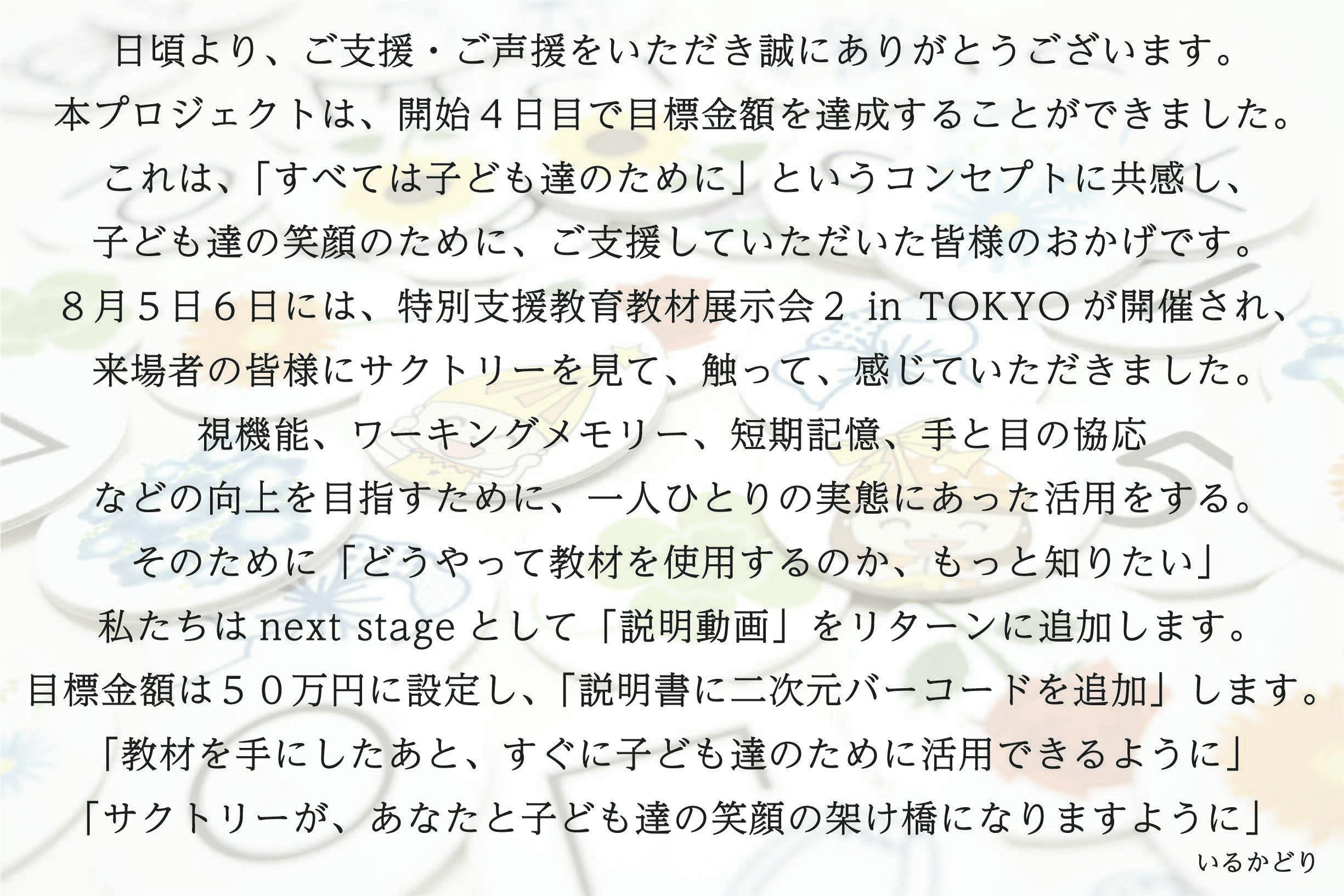 2024/05/22 21:00こんにちは。空に架かる橋 代表 の いるかどり です。この度、新プロジェクトである特別支援教育教材展示会の開催に向けたクラウドファンディングで25%という大きな節目を迎えられました。皆様のご支援のおかげです。心より、深く感謝申し上げます。私は、私立幼稚園や公立小学校で15年以上、教員として子どもたちと向き合ってきました。日々変化する教育環境の中で、常に子どもたちの成長を願い、教員として努力を重ねてきました。しかし近年、教員の負担増加が深刻化し、子どもたちと向き合う時間が減っているという課題が顕著になっています。長時間労働や事務作業の増加によって、教員の心身の健康を損なうケースも増えています。これは、子どもたちの未来にとっても大きな損失です。教員は、子どもたちの成長に寄り添い、一人ひとりの個性を引き出す存在です。しかし、教員自身が余裕を失い、本来の業務に集中できない状況では、子どもたちの教育に悪影響を及ぼすことは避けられません。だからこそ、私たち教員を取り巻く環境を改善し、働き方改革を実現することが急務なのです。今回のクラウドファンディングは、まさにその一歩です。皆様のご支援は、子どもたちの笑顔を守るための希望の光です。この光を力に変え、先生方が笑顔で輝き、子どもたちが伸び伸びと学べる環境を実現できるよう、プロジェクトチーム一同、心を込めて取り組んでまいります。現代の教育は、大きく変化しています。グローバル化や情報化社会の進展に伴い、子どもたちに求められる能力も多様化しています。従来の画一的な教育では対応しきれない部分も多く、教員はより高度な専門性と柔軟性を求められています。しかし、現状の教員の働き方では、新たな教育ニーズに対応するための研修や研究に十分な時間を割くことが難しくなっています。さらに、事務作業の増加や部活動指導などの負担も教員の負担を大きく増加させています。教員が本来の業務に集中できない状況は、子どもたちの教育の質の低下にもつながります。働き方改革は、単に教員の負担軽減だけでなく、子どもたちのより良い教育環境の実現にも不可欠なのです。子どもたちの未来へ、共に歩みましょう。今回のクラウドファンディングは、教員の働き方改革を実現するための重要な一歩です。しかし、これはまだ始まりに過ぎません。今後は、行政や民間企業と連携し、より広範な取り組みを進めていく必要があります。皆様のご支援は、この大きな目標達成に向けた大きな力となります。子どもたちの笑顔のために、先生たちの笑顔を!引き続き、温かいご支援と応援をよろしくお願いいたします。特別支援教育教材展示会 支援ページはこちら空に架かる橋いるかどり もっと見る最新作 教材データ集 ver.2024.season3 漢字の再受付が決定しました!