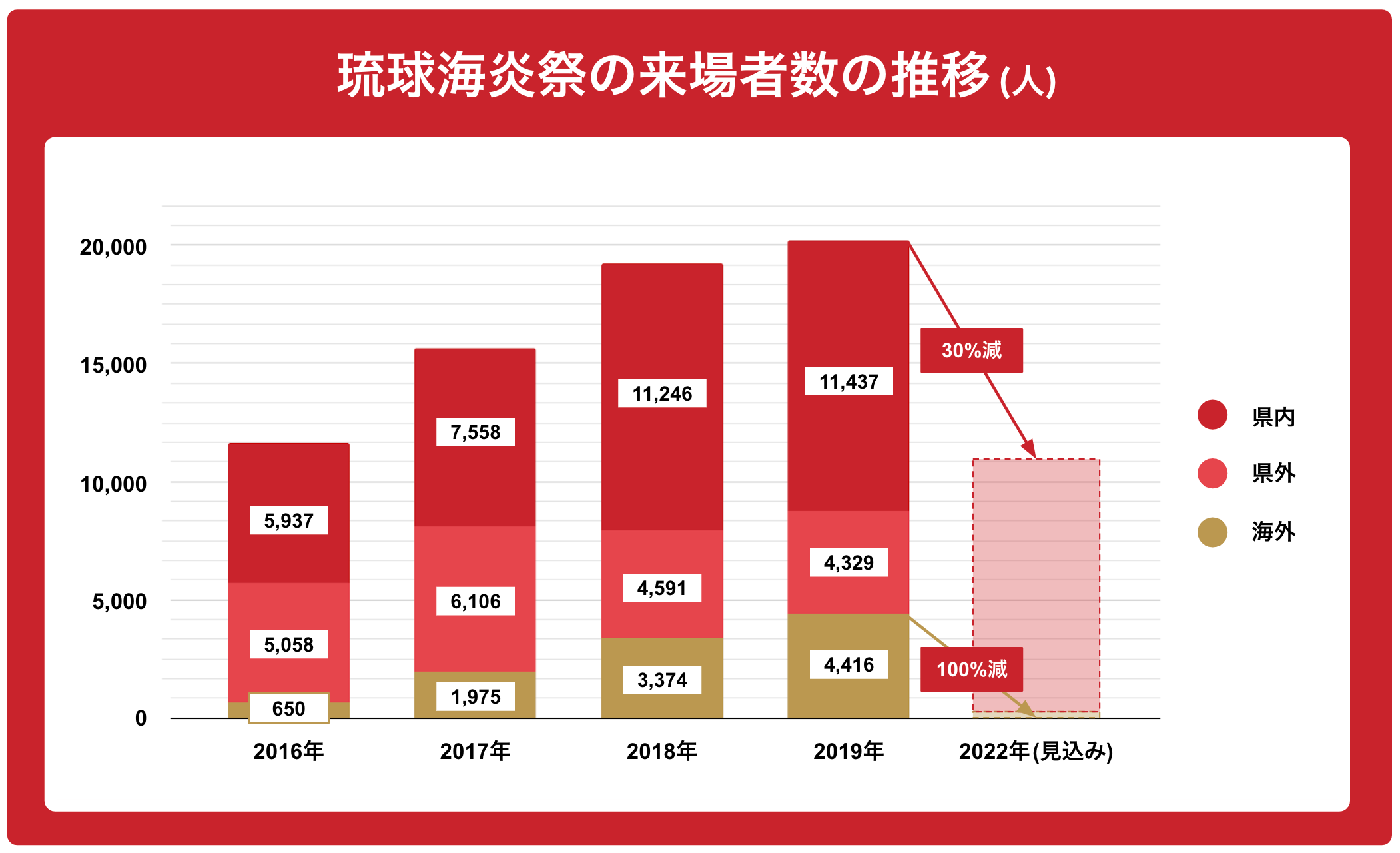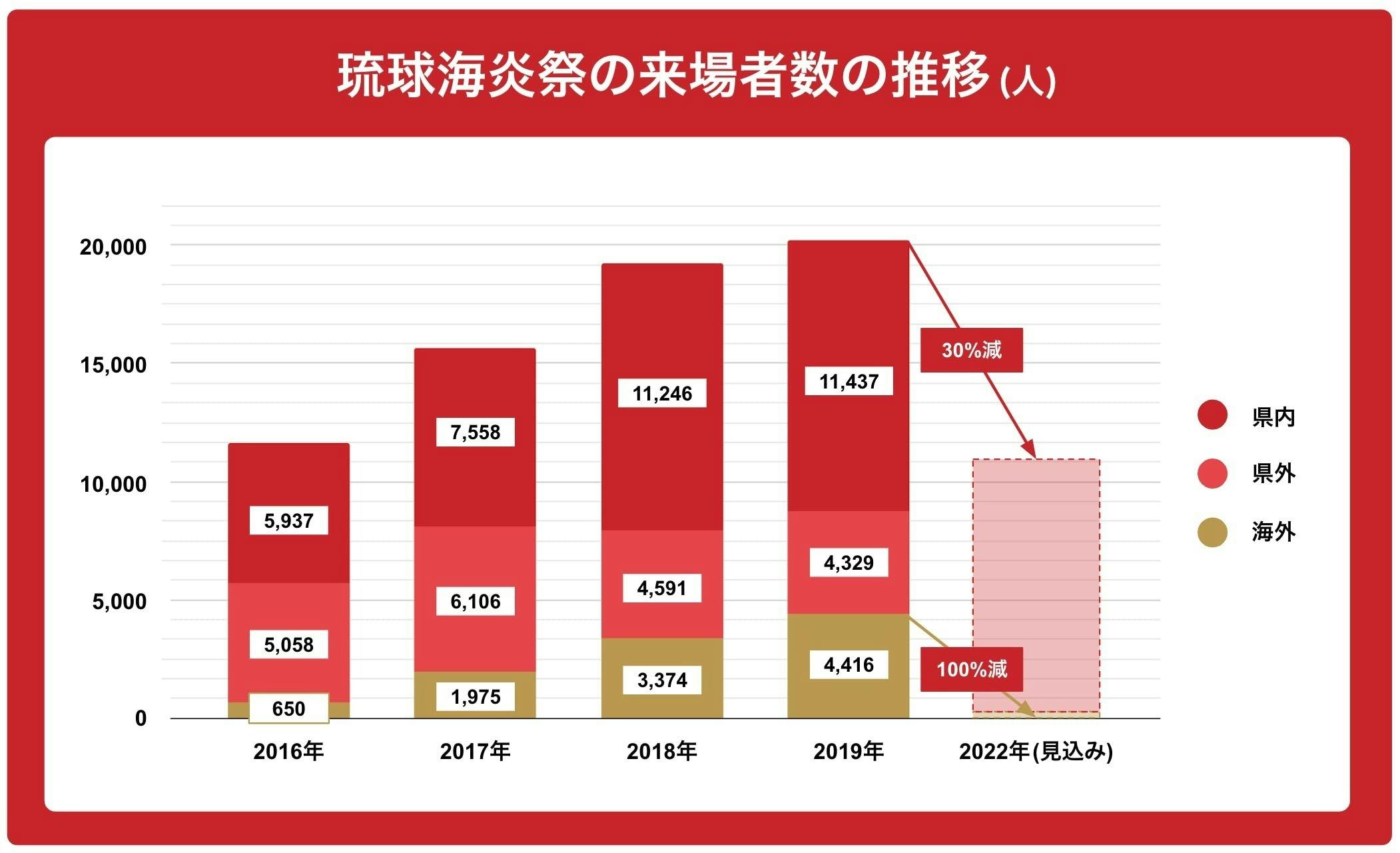 しかし、新型コロナの影響で、沖縄県への入域観光客数は激減しており、国外からは台湾を中心に2019年には約5,000人にご来場いただいておりましたが、今年は日本への入国制限の影響で0人となります。また、企業協賛も5月23日時点で決定している企業さまは、2019年対比で30%で、これから県内の企業さまを中心にご支援を募っていきますが、未だ不透明な部分がございます。