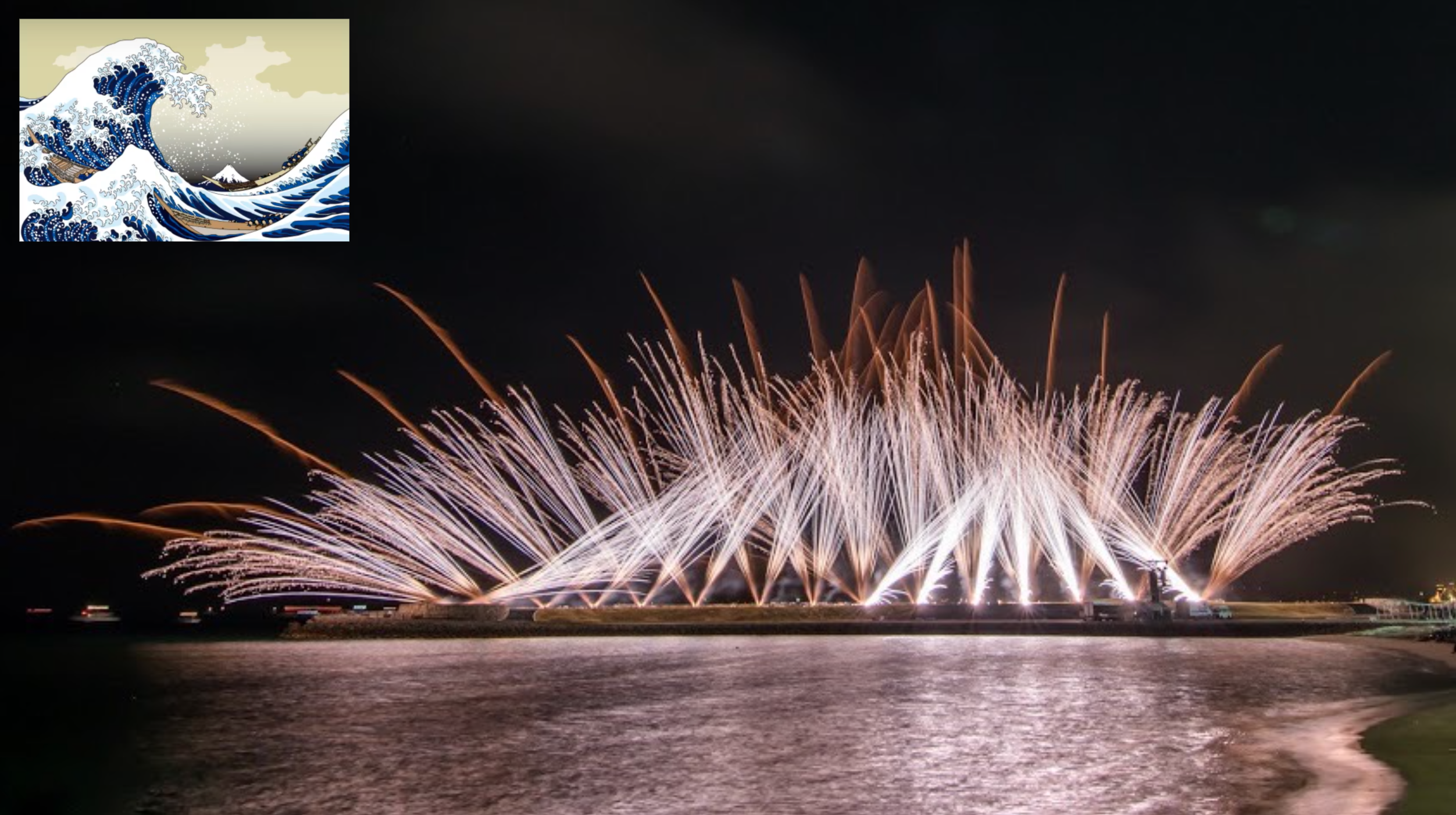 アメリカ合衆国の雑誌『LIFE』で「この1,000年で最も功績を残した世界の人物100人」にも選出された、天才浮世絵絵師、葛飾北斎の代表作『神奈川沖浪裏』で描かれた波の動き、水しぶき、富士山を花火で夜空に表現します。