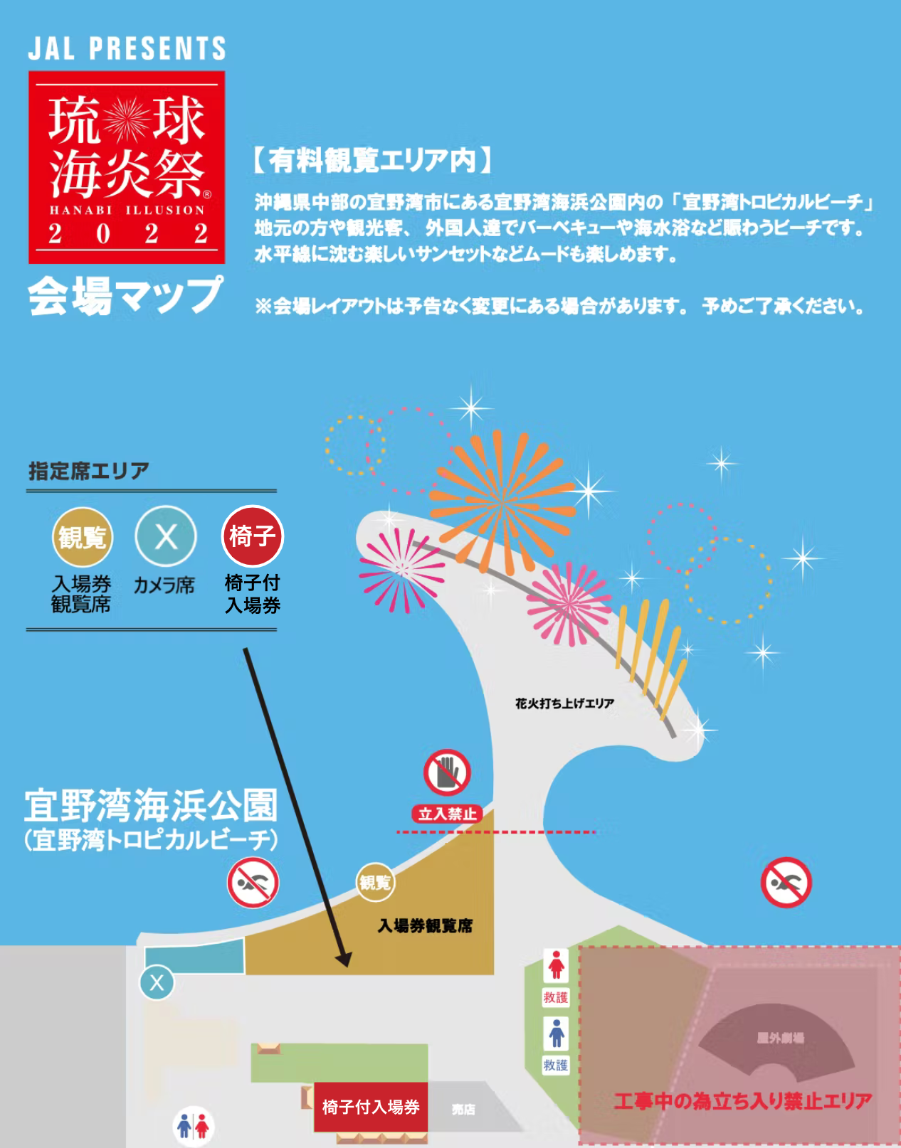 琉球海炎祭の当日チケット(入場券・駐車券付き・カメラ席を含む)をリターンとしてご用意しています。入場券観覧席は上の図の通りです。お車でお越しの方は「駐車券」もお忘れなくご購入ください。チケットは当日までに、メールにてPDFでお送りいたします。ご来場いただく際は、チケットを印刷して受付でお見せください。